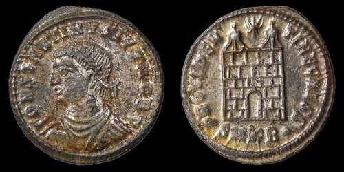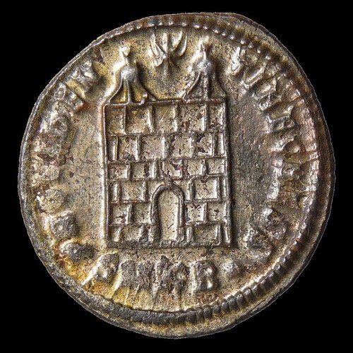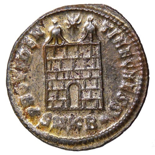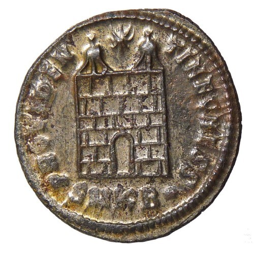 Reverse: PROVIDENTIAE CAESS (Latin abbreviation: Providentiae duorum Augustorum = "[Dedicated to] the foresight of the Caesars". Campgate, with star between two turrets and open doorway, SMKB? in exergue--mint mark=Sacra Moneta Cyzicus Officina B.