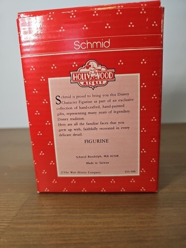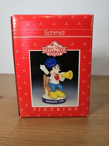 Add a touch of Hollywood to your collection with this vintage Schmid porcelain figurine of Mickey Mouse. With its exquisite detailing, this 4" tall collectible is a must-have for fans of both Disney and Hollywood. Made in Taiwan, this figurine is a timeless piece that captures the charm and magic of Disney's beloved icon. This unique piece is perfect for collectors of all ages and is sure to be a standout addition to any collection. Celebrate the golden age of Hollywood with this timeless collectible, featuring Mickey Mouse in his classic pose.