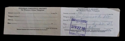 Pullman Employe's Receipt--for Wester Union Telegram -Stamped APR2238 LIVINGSTON.MONT.