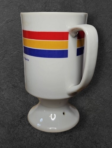1970s vintage Maxwell House International House footed pedestal ceramic mug. White body with the signature red, yellow, and blue stripes, with Suisse Mocha, Cafe au Lait, and Cafe Vienna as detail.