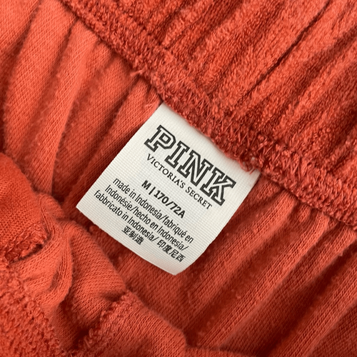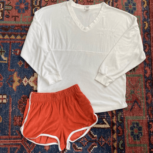 Two-piece Victoria?s Secret pink outfit, including an oversized V-neck Terry cloth pull over with tonal pink embroidered at the chest, and terra-cotta desert hue Terry cloth retro 70s style high waist shorts with white piping and elastic waist.. The shorts also have tonal logo up one hip embroidered. Laying flat the Oversize top measures 27 inches shoulder to ham on the top and 25 inches armpit to armpit. The shorts measure 12 inches straight across the waist relaxed stretching to 16 inches without much resistance. 11.5 inch rise and 2.5 inch inseam. I am not interested in separating the set at this time.