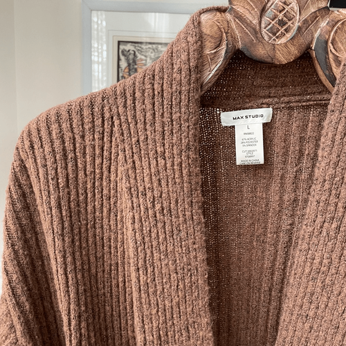 Max studio soft and chunky acorn brown cross front wide rib sweater. Laying flat measures 24 inches shoulder to ham with an additional 3 inches in the back and 21 inches armpit to armpit