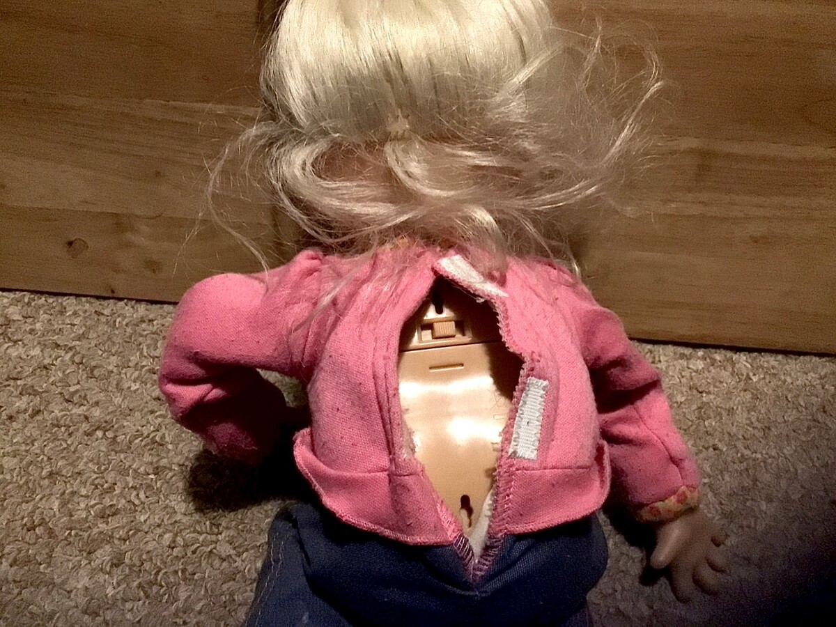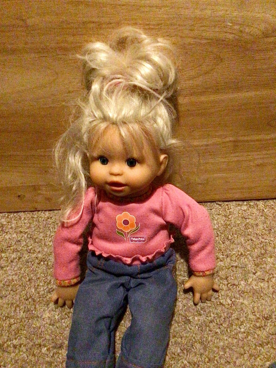 The is the Fisher Price doll. She was supposed to interact with her body parts but the battery coil is eaten from battery rust.. Someone left batteries in there and they exploded completely eating away one battery connector coil. I bought her this way not knowing this. I only found when I opened her up to check her out before selling her. The outside of the body is in good condition. Her hair needs a good taming though.