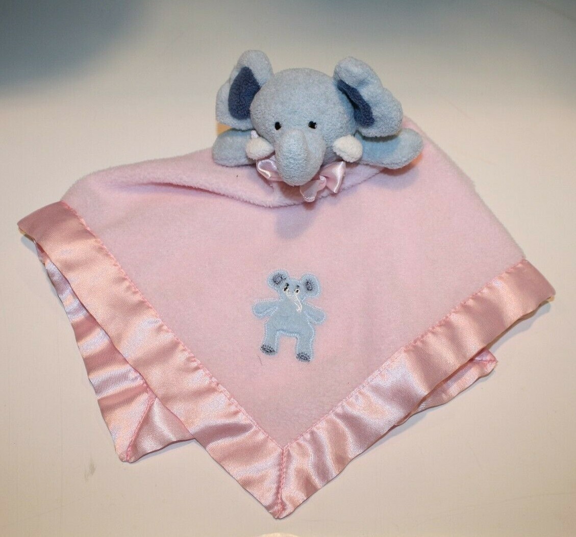 Features: Pink and blue plush elephant security blanket. Pink polyester fleece blanket with pink satin border. Soft, two-tone blue chamois plush elephant with fleece embroidered elephant on corner