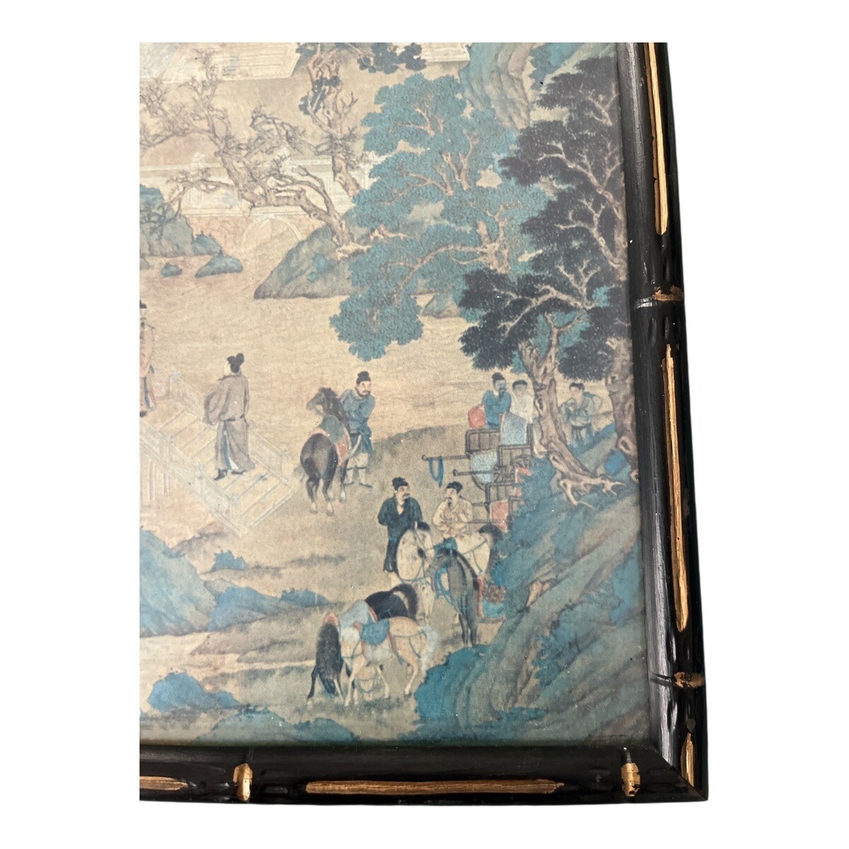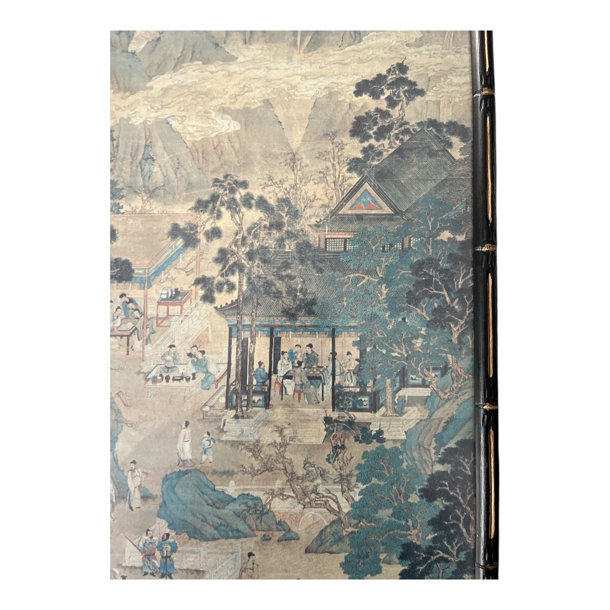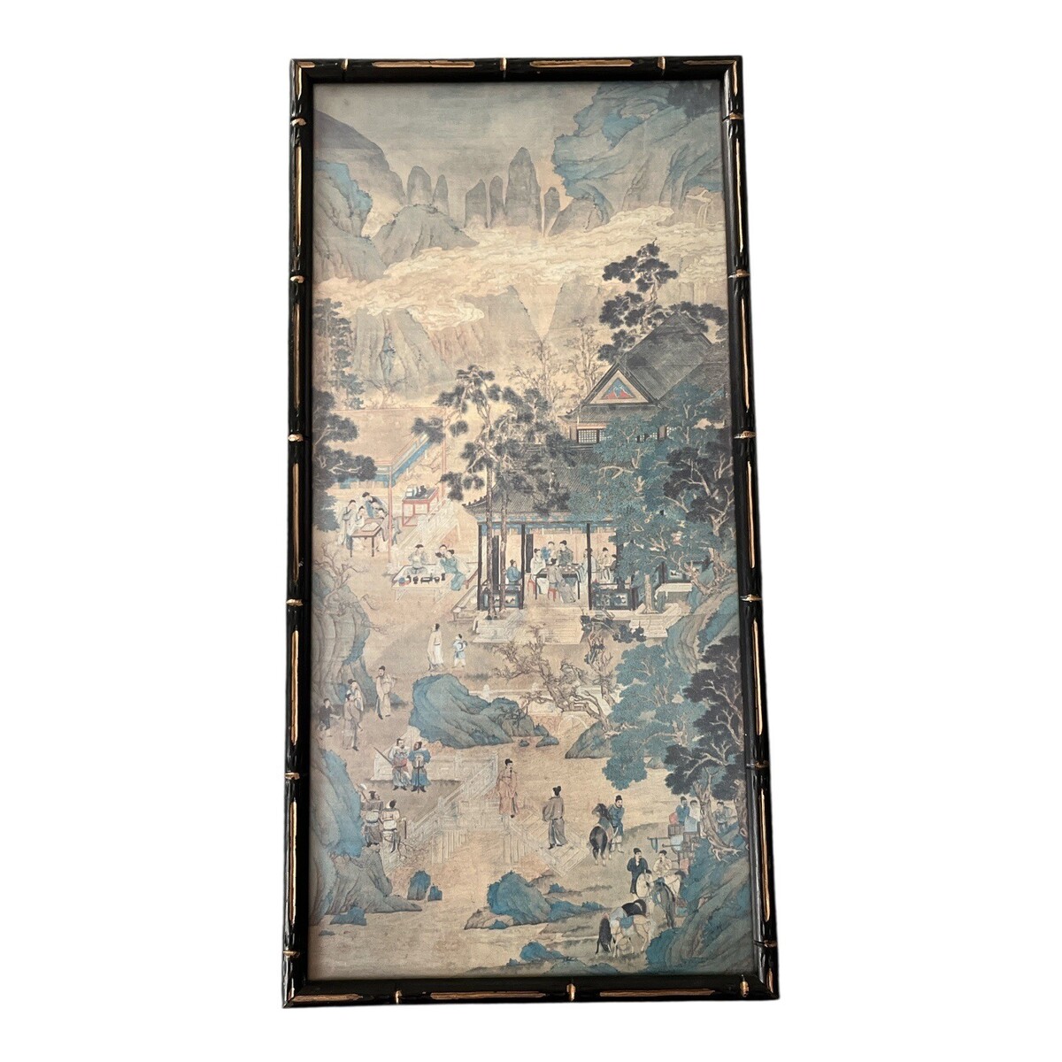 This piece is a later printed reproduction, presented in a narrow vertical format and housed in a black frame with gold bamboo-style accents. The artwork features muted earth tones with blue-green highlights and fine illustrative detail typical of classical Chinese landscape compositions. Ready to hang.