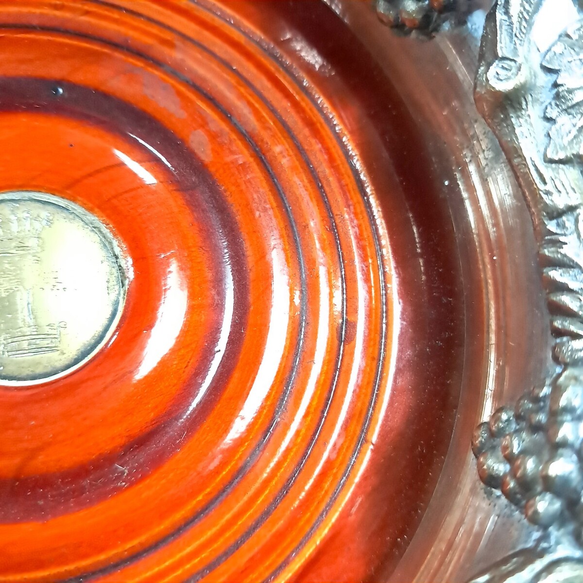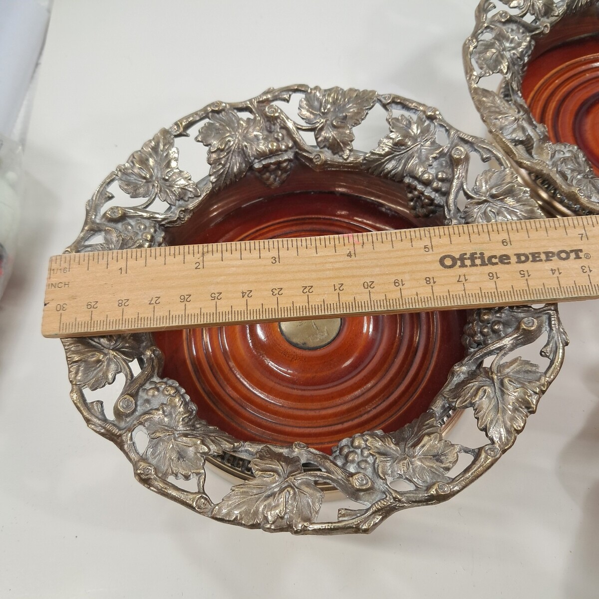 Some wear/patina/areas where silver plate has rubbed off from use as shown. See pics for details. Includes 2 coasters, see pics for measurements.