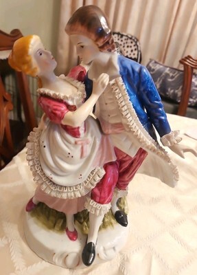 Vintage Porcelain Kiss Me Couple Colonial Lovers Sweethearts Statue 12.5" H