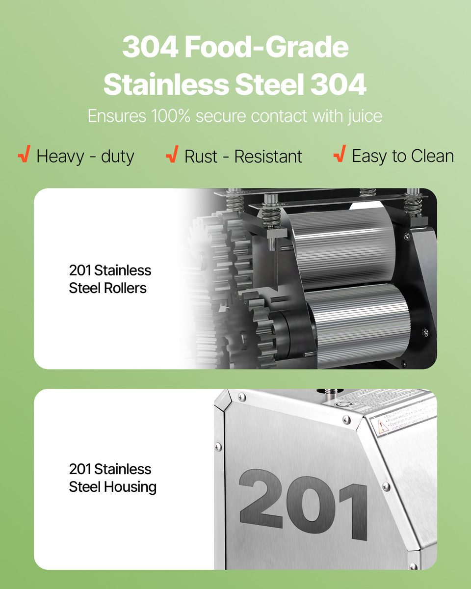 • Stainless Steel Construction: Crafted from thickened stainless steel, this sugar cane juice extractor is built to last and is easy to clean. It includes a 304 food-grade juice tray and fine filter screen for smooth, fresh juice without pulp or odor