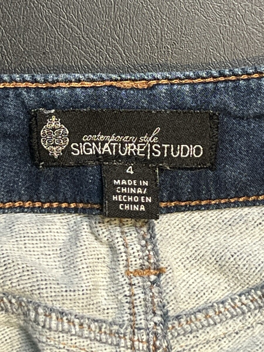 The product is a pair of contemporary style Signature Studio women's skinny jeans in size 4. The jeans feature a rolled cuff and come in a sleek blue color. With a regular fit and designed specifically for women, these jeans offer a modern and stylish look perfect for everyday wear.