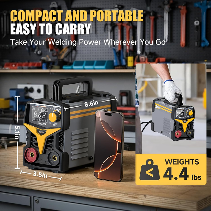?Lightweight Portable Welder?: Weighing just 4.4 lbs, size: 3.5*8.6*5.1inch.This portable welder is easy to carry to any job site. Compact yet powerful, this mini welding machine improves work efficiency.