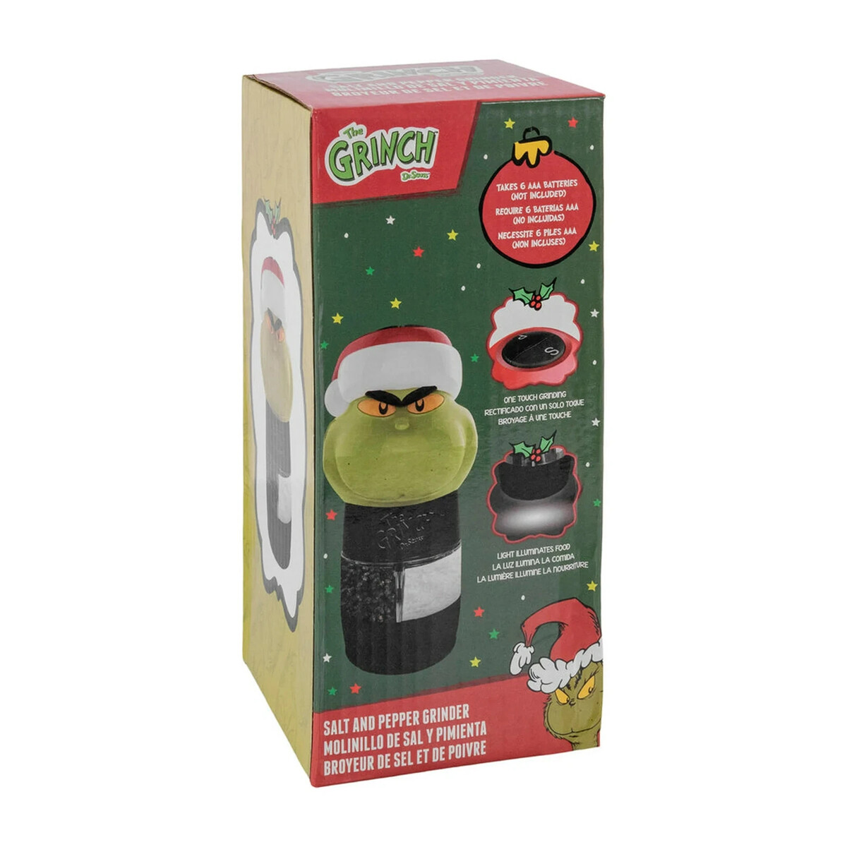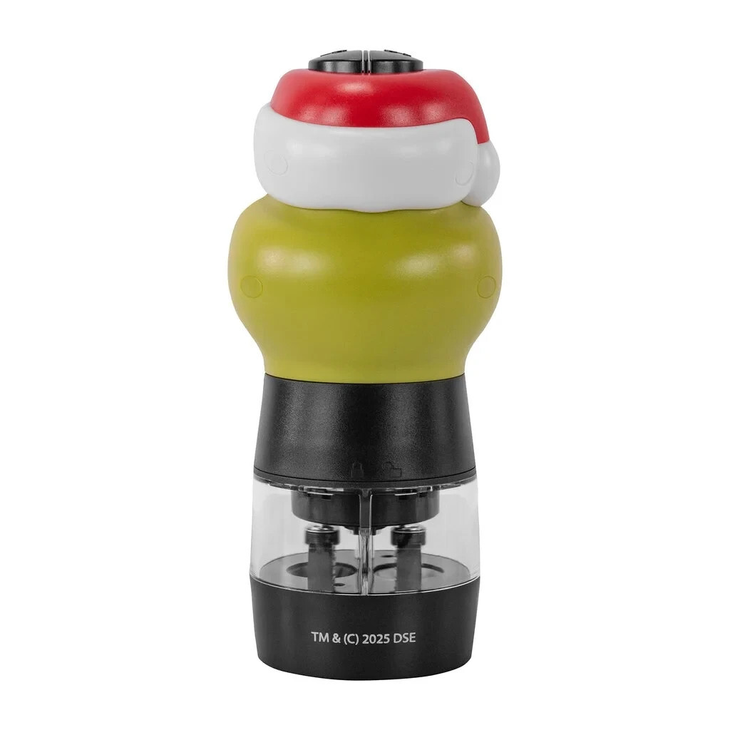 Add a dash of holiday mischief to your meals with the Uncanny Brands Grinch Salt Pepper Grinder! 3D molded with classic Grinch flair, this dual-chamber electric grinder is both festive and functional. One-touch grinding makes seasoning effortless, and the built-in LED light turns on automatically while dispensing. Adjustable settings let you choose between fine or coarse seasoning to suit any dish. Compact, eye-catching, and ready for holiday hosting!