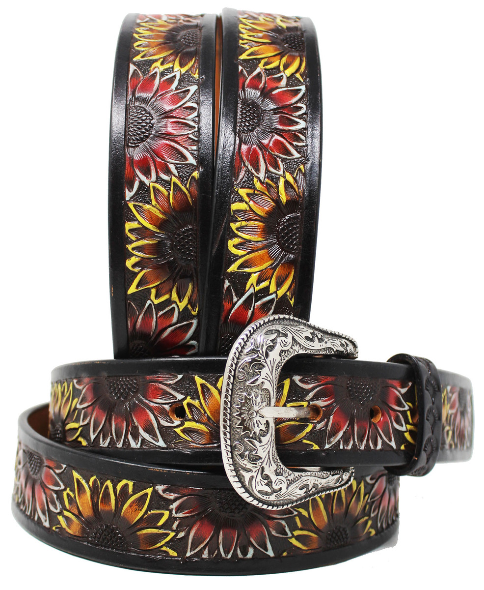 Challenger 1-1/2" wide belt made from genuine heavy-duty full grain cow leather. Belt is beautifully accented with hand tooled sunflowers. We recommend to go 2" up from your waist size for a comfortable fit. Comes with a removable engraved silver buckle.