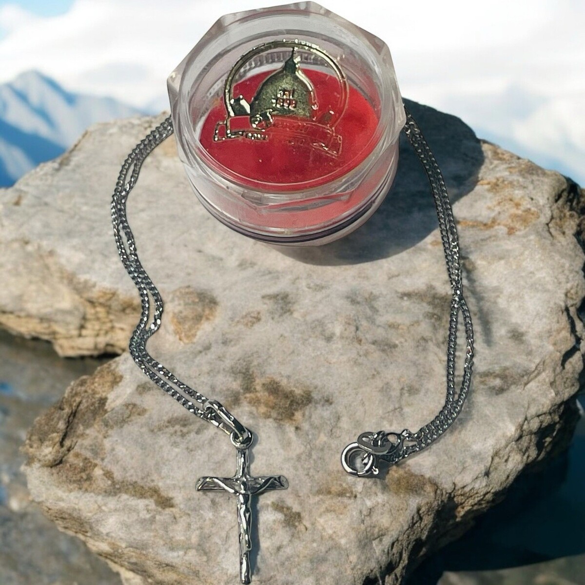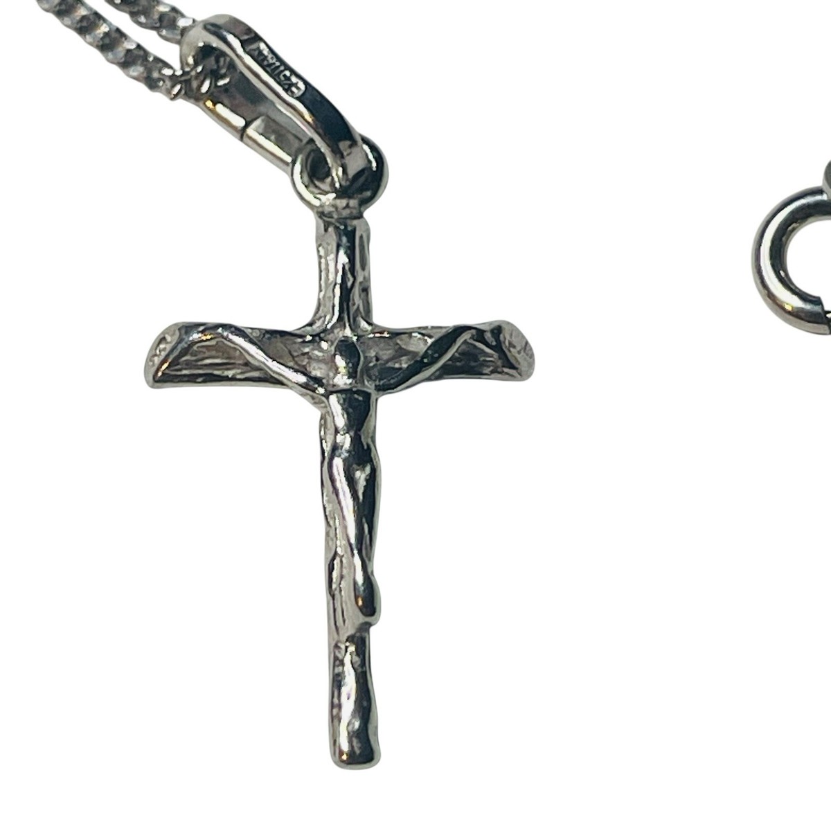 This vintage crucifix necklace is a beautiful piece of religious jewelry that would make a great addition to any collection. The necklace features a sterling silver metal crucifix pendant and comes in a plastic case. The pendant showcases a stunning design and is made in Italy.