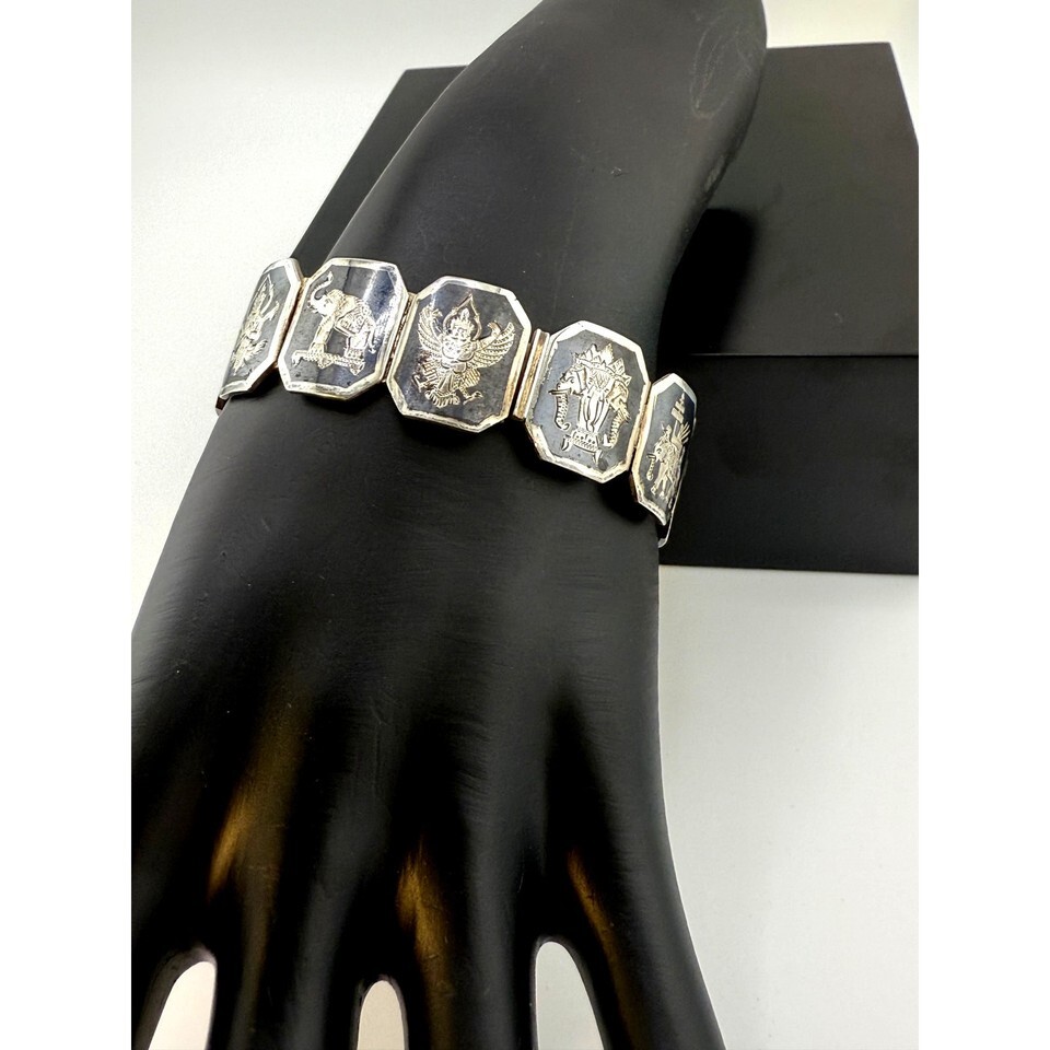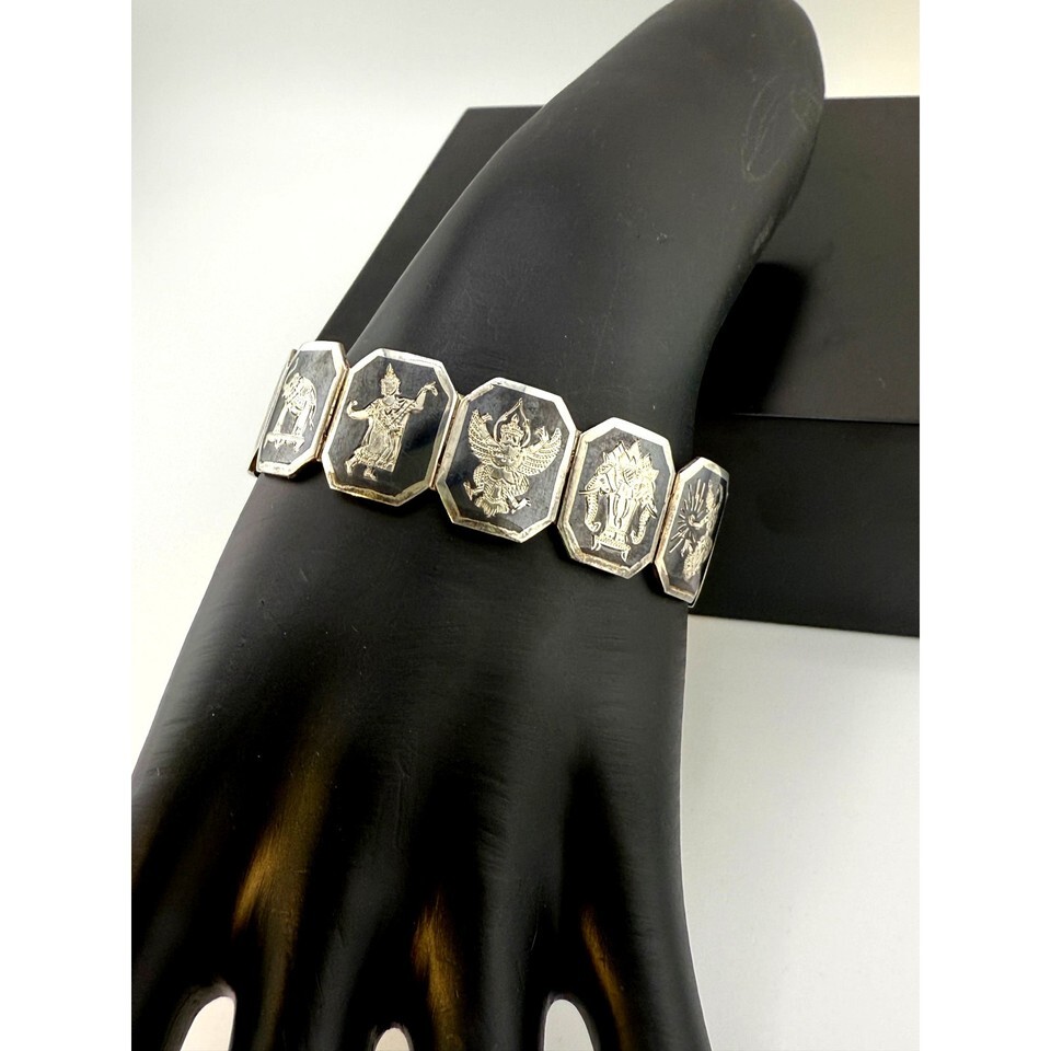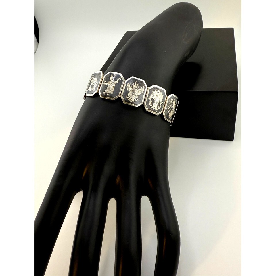 A GIFT BOX AND BAG WILL BE INCLUDED WITH EVERY ITEM PURCHASED DURING THE HOLIDAY SEASON.Lovely sterling silver with black onyx bracelet with 12 octagonal panels of dancers and animals such as elephants.. Measures about 6.75 inches. A wonderful and valuable vintage collectible.