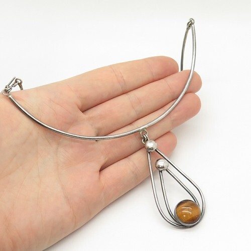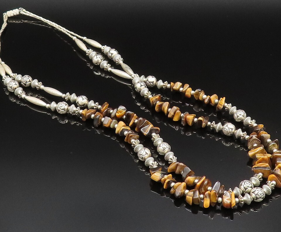 925 Silver Vintage Engraved Sphere Bar & Tiger's Eye Layered Necklace NE3877