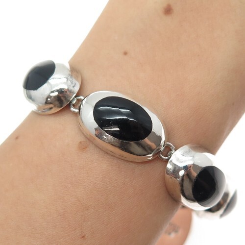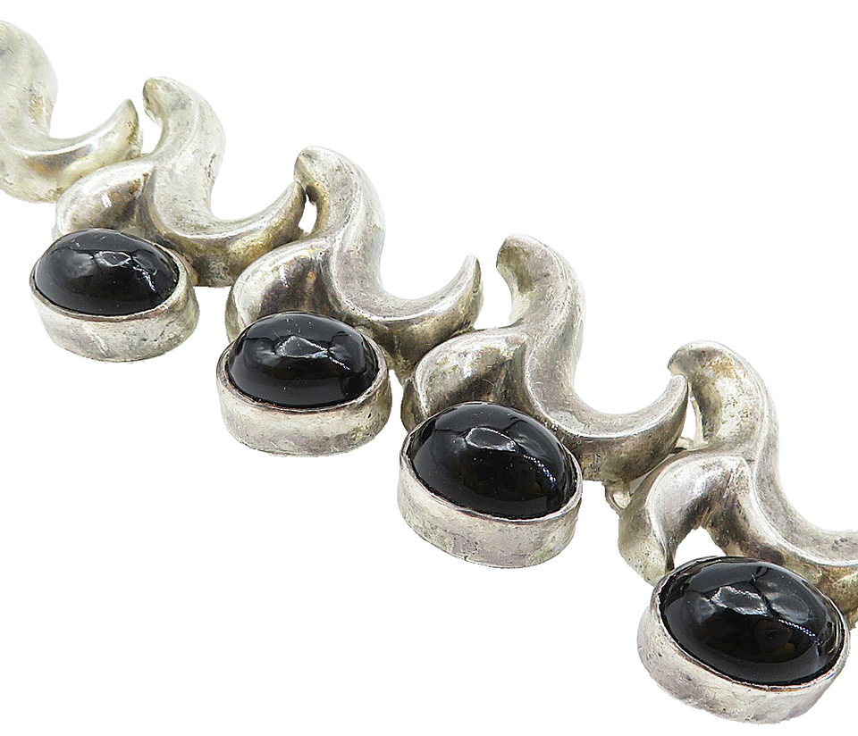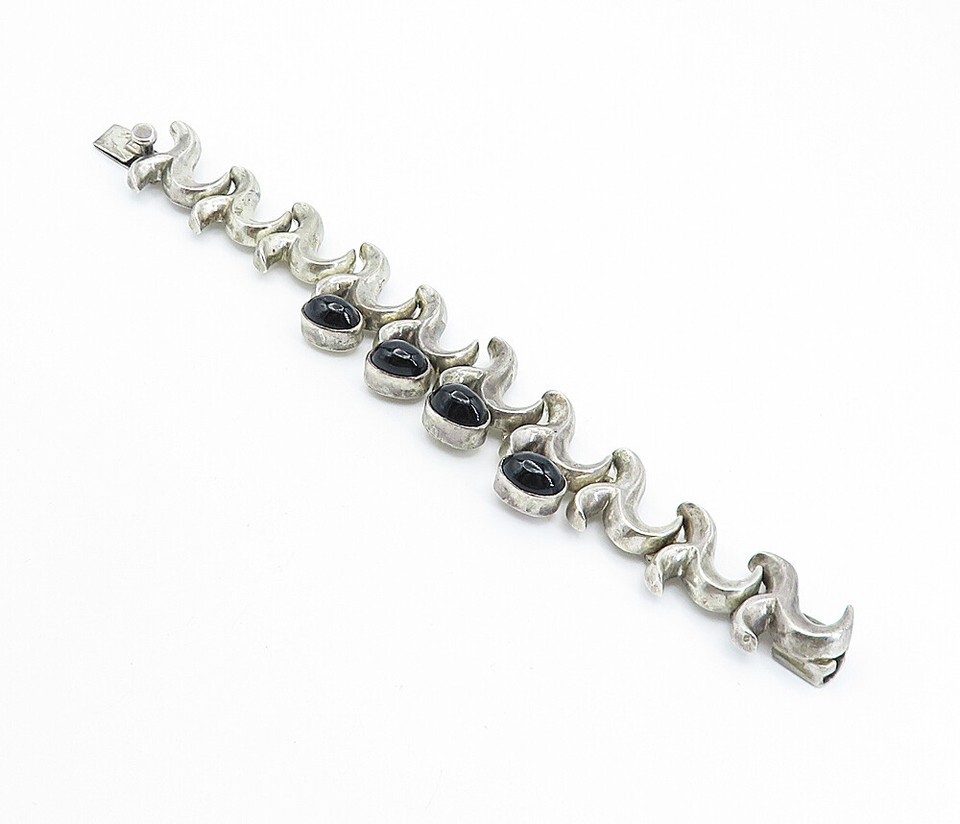 MEXICO 925 Sterling Silver Vintage Black Onyx Swirl Chain Bracelet BT2816