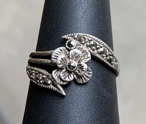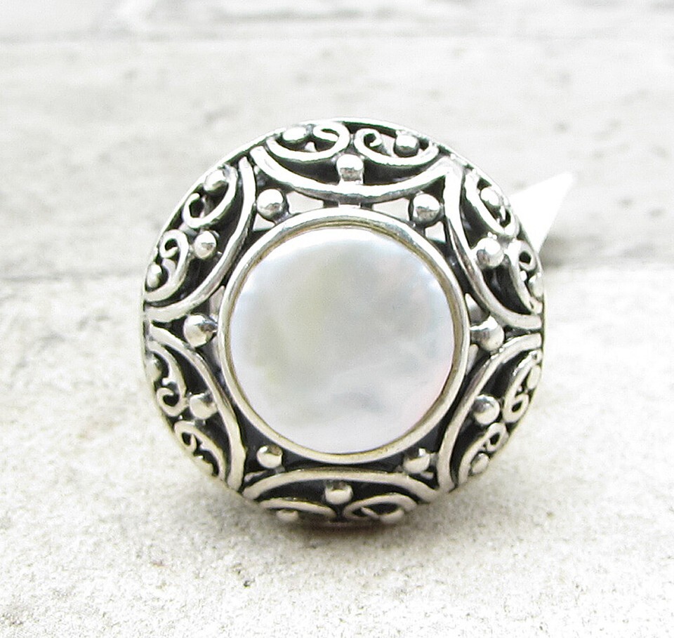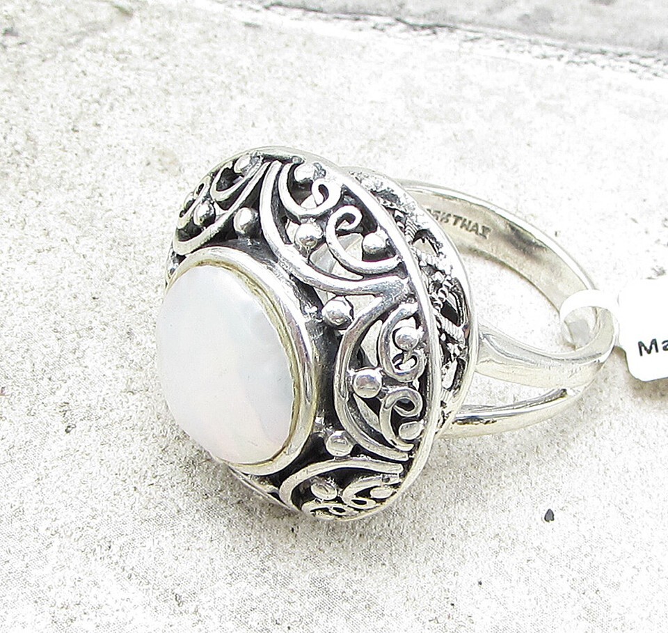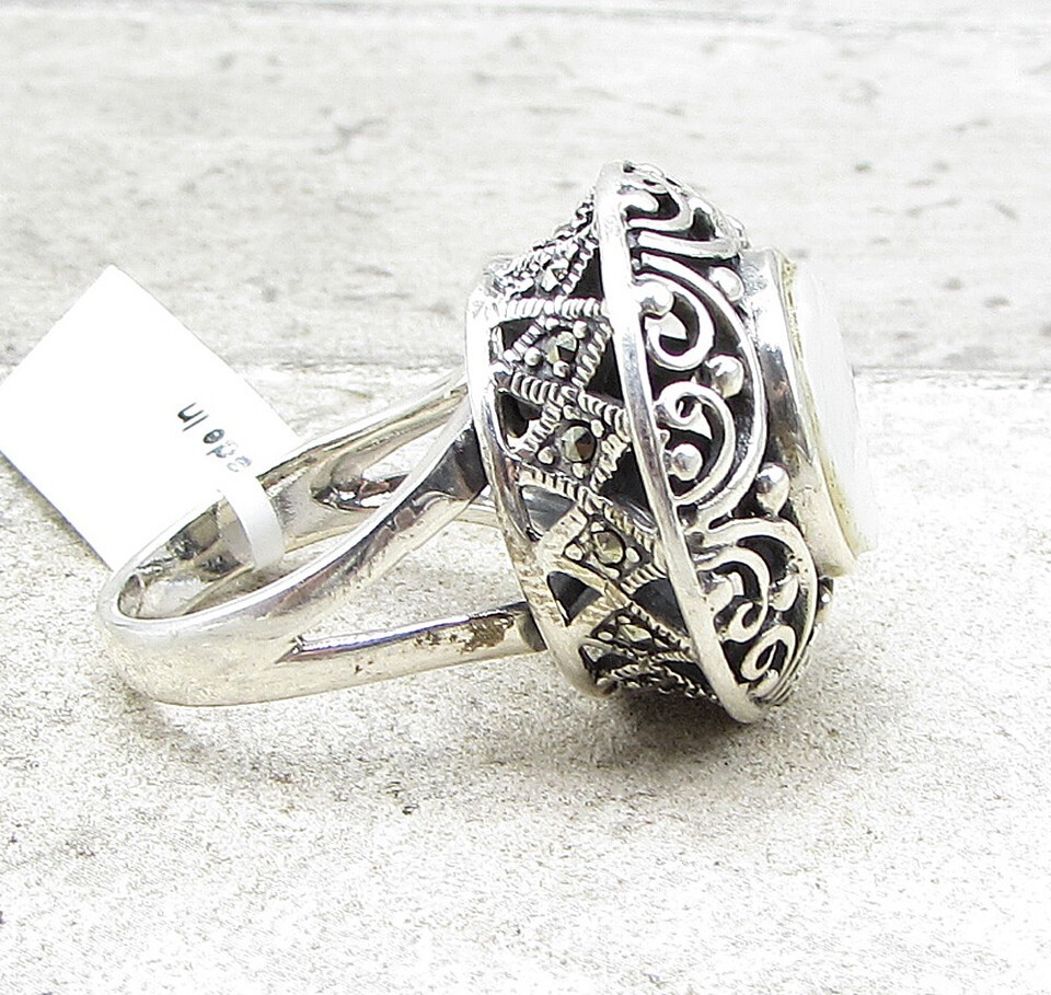 925 Sterling Silver Mother of Pearl & Marcasite Filigree Ring Sz 7.5 RG1420