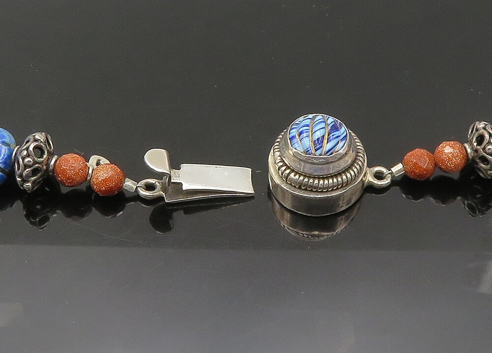 925 Silver Vintage Lapis Lazuli Sodalite & Goldstone Chain Necklace NE3529