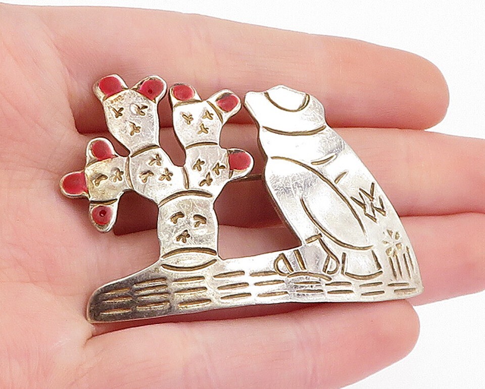 MEXICO 925 Sterling Silver Vintage Enamel Desert Cactus Brooch Pin BP2022