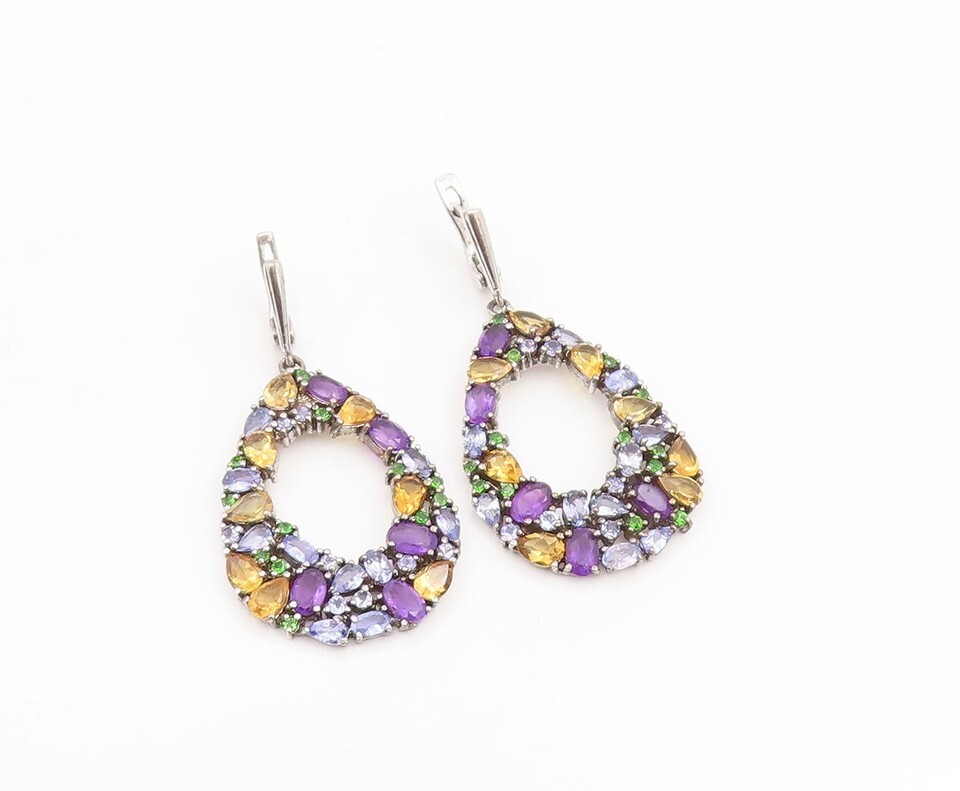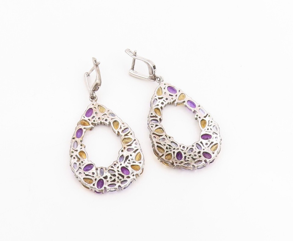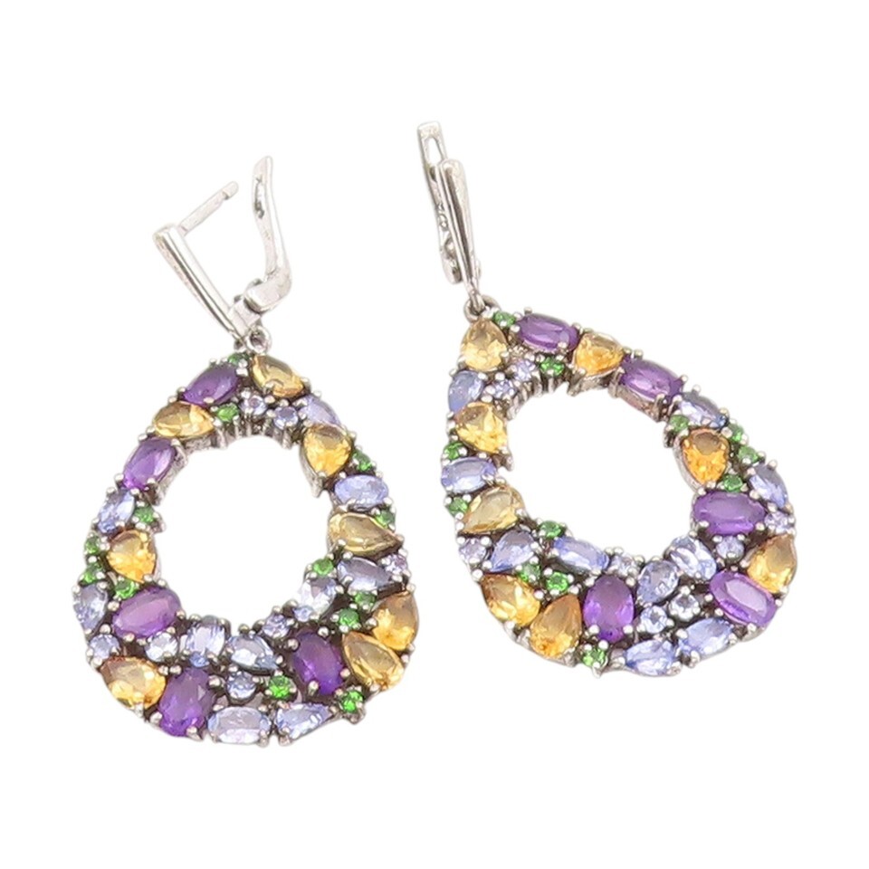 925 Sterling Silver Vintage Earrings Multi Gemstone Teardrop Cluster EG13854