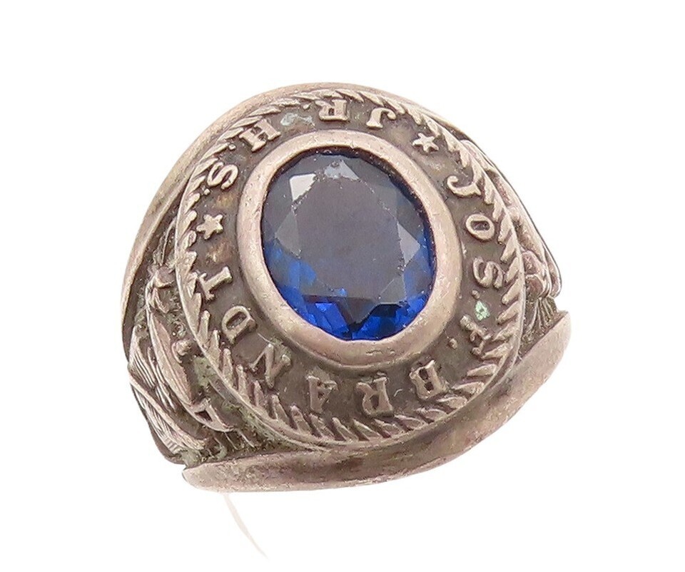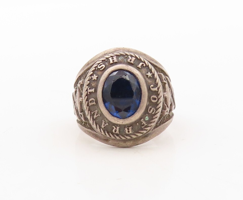 925 Sterling Silver Vintage Carved 1976 High School Sapphire Sz 7.5 RG31029