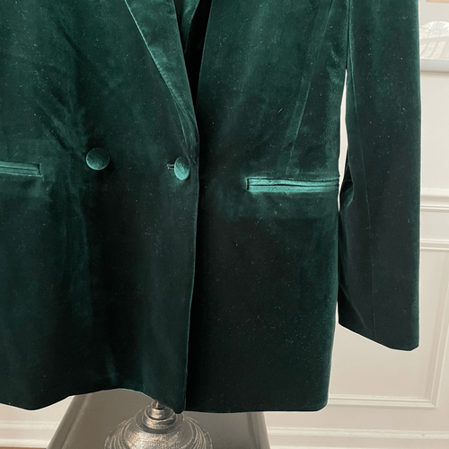 INC International Concepts green double breasted velvet blazer with notched collar. The buttons are fabric covered. The pockets are decorative. Lane flat measures 29 inches shoulder to ham and 19 inches armpit to armpit. 100% polyester satin. Lined.