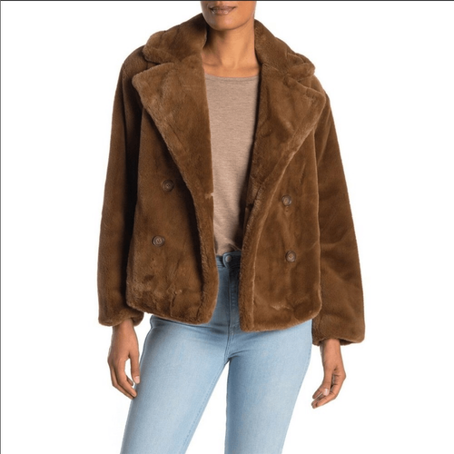 A super soft and plush faux fur jacket features a double breasted closure and convenient pockets for ultra-chic style. Fit: this style fits true to size. - Notch lapel - Long sleeves - Double-breasted closure - Slash pockets - Solid color - Faux fur construction - Lined