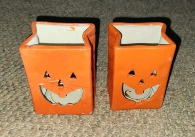 Pair Jack O Lantern Ceramic "Bag" Tea Light Candle Holders Halloween Fall Happy