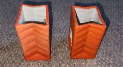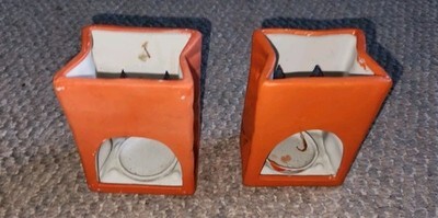 Used condition candle holders. Tea light size. Bag design. Ceramic. One has a crack in the face. They measure 4 inches tall 3 inches wide 2.25 inches deep.