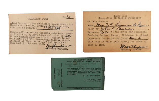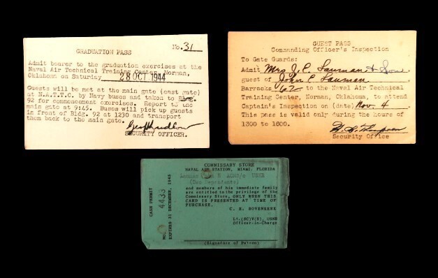 Some yellowing consistent with age of paper. Very Rare US Navy John Lauman AOM 3/C graduated first in his class of 27, 31 hours of flight time. Nice hard to find grouping of passes 2 from 1944 Norman Oklahoma, and one for the commissary store in Miami FL 1945. Please see the photos for any condition issues.