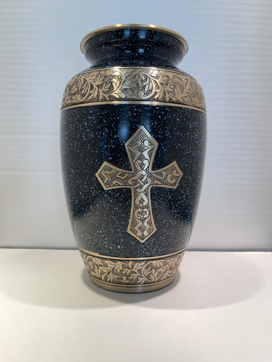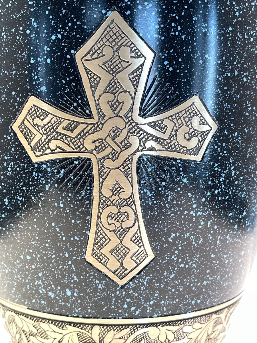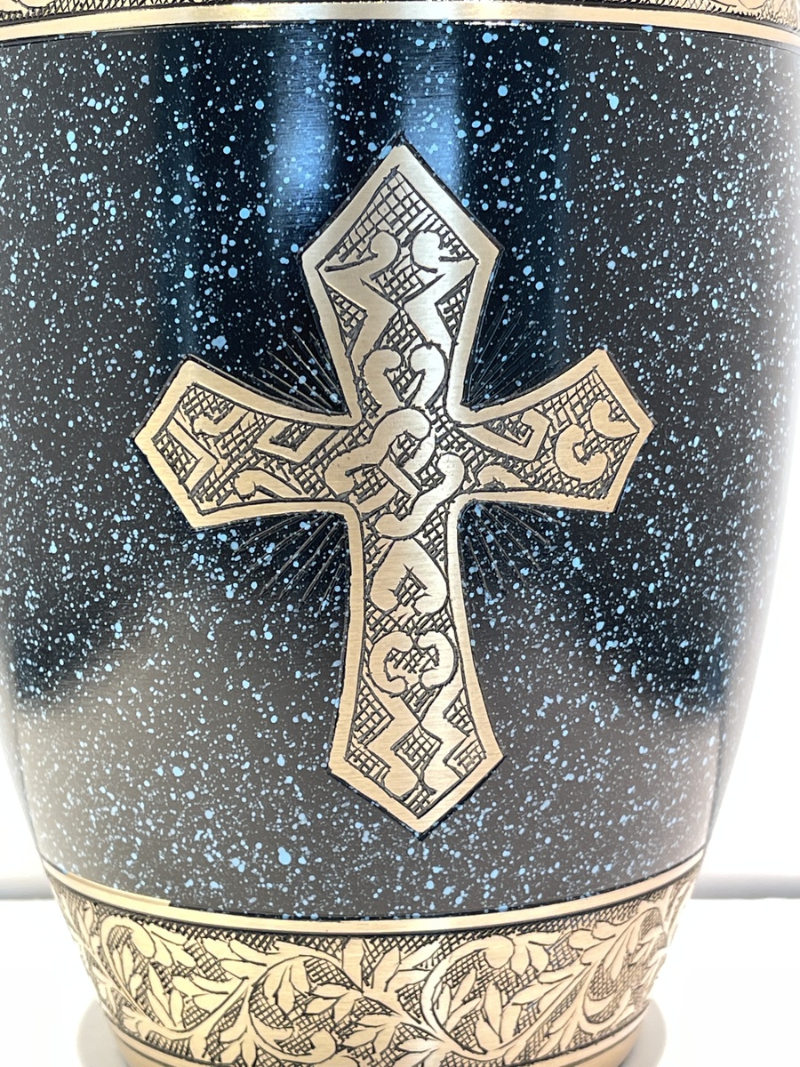 Beautiful handmade solid Brass Midnight Sparkle-Etched Cross. The amount of detail work shows the quality of each urn. This is large Adult urn.