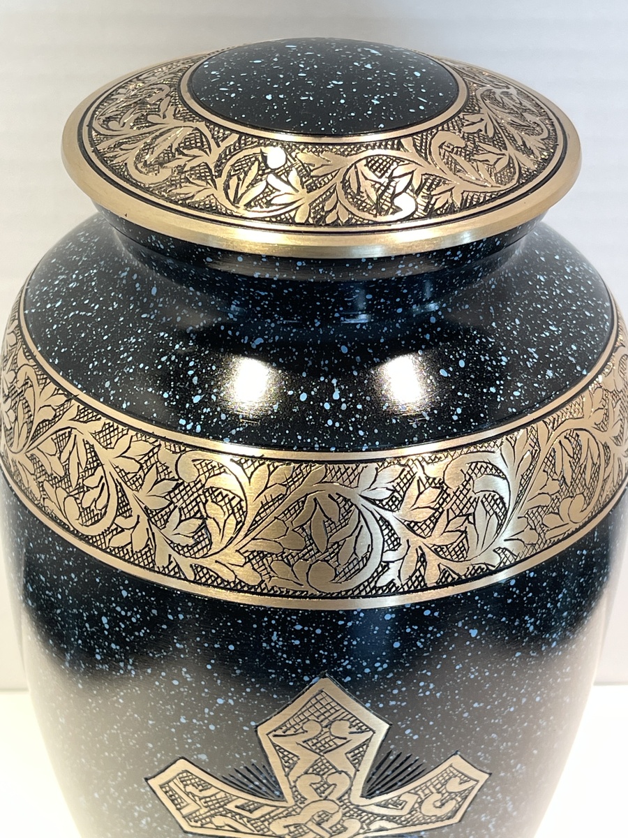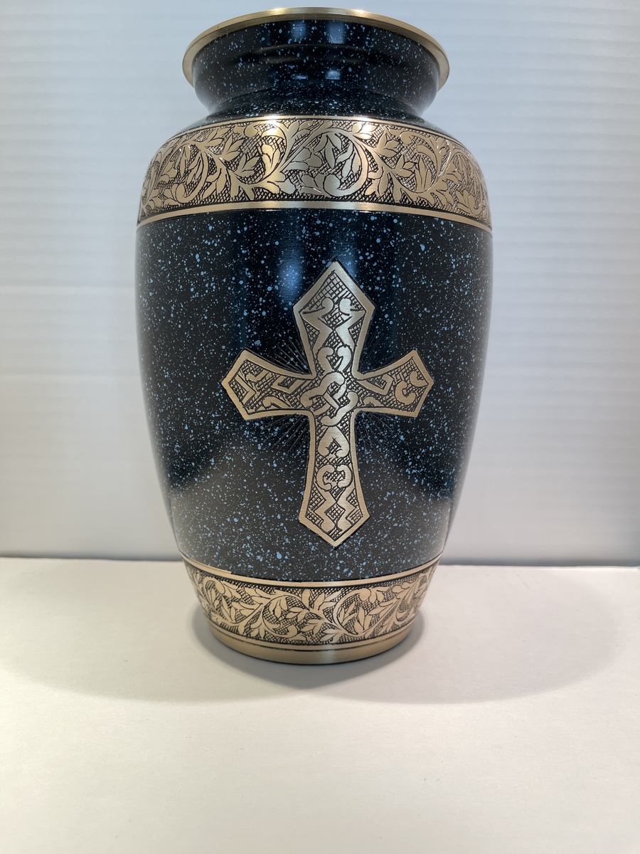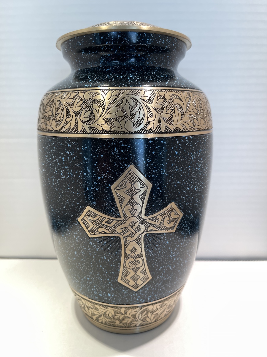 Beautiful handmade solid Brass Midnight Sparkle-Etched Cross. The amount of detail work shows the quality of each urn. This is large Adult urn.