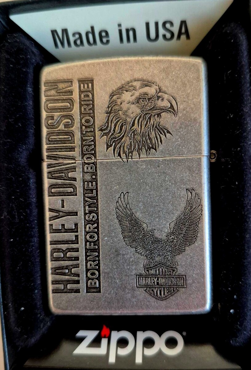 The product is a rare 2020 antique silver plate double-sided Harley Davidson Zippo lighter, featuring a sport-themed design. Made by the renowned brand Zippo in the United States, this lighter is a unique and collectible item that would appeal to both Harley Davidson enthusiasts and Zippo collectors. The dual-sided design adds an extra element of interest, making it a desirable piece for those who appreciate fine craftsmanship and nostalgic items.