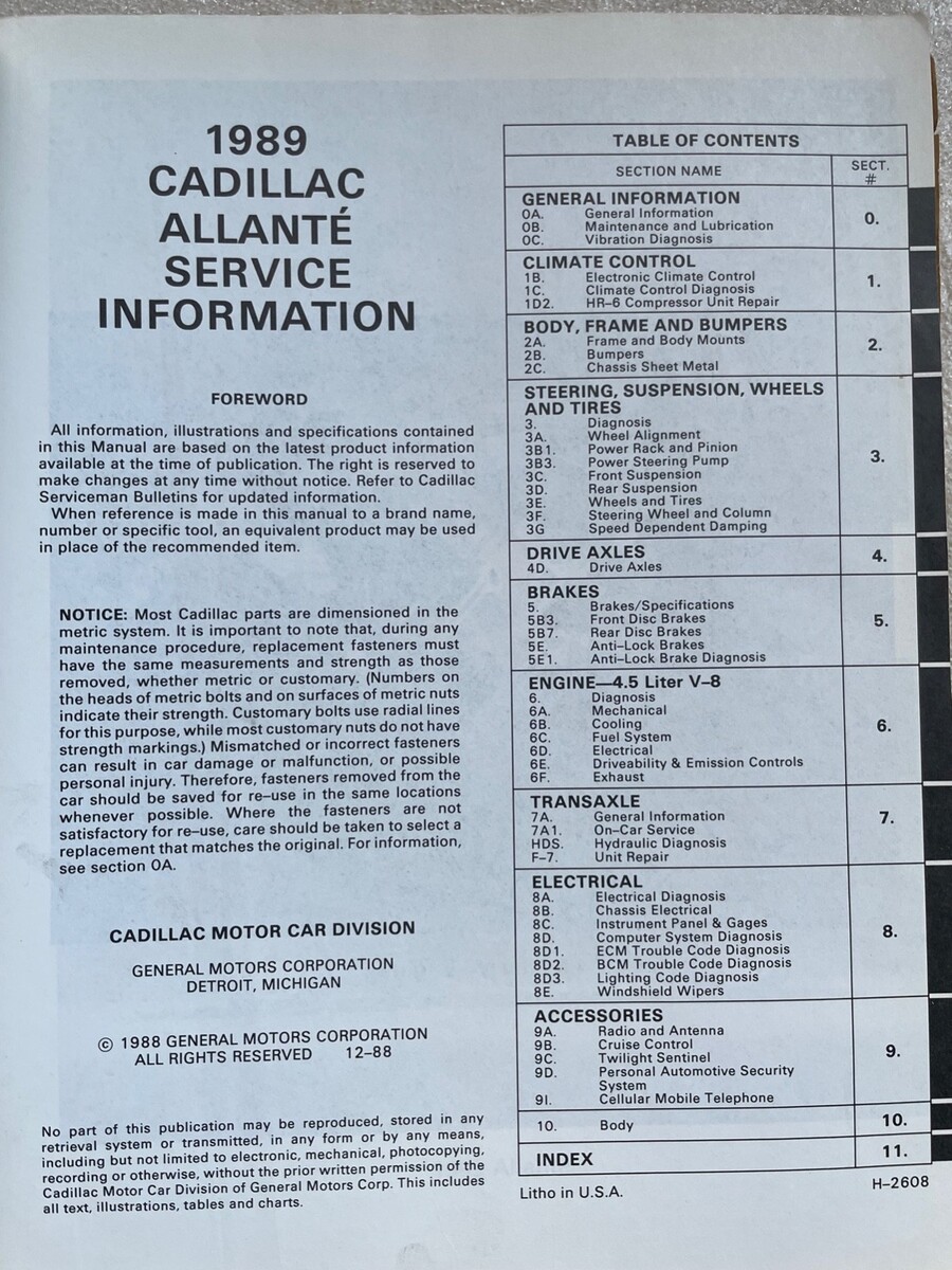 1989 Cadillac Allante Service Information Manual. Shop Repair/Maintenance