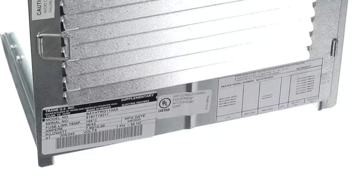 Trane BAYHTRG110A (5191T19211) Heater / Element Assembly is a genuine OEM electric heat kit designed for Trane air handler systems. Operating on 208/240 Volt, single-phase power, this assembly provides 7.5 KW at 208V and 10 KW at 240V, delivering reliable supplemental or primary electric heat. Engineered to Trane?s exact specifications, it ensures proper heat output, safe electrical operation, and dependable performance for residential and light commercial HVAC applications.