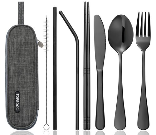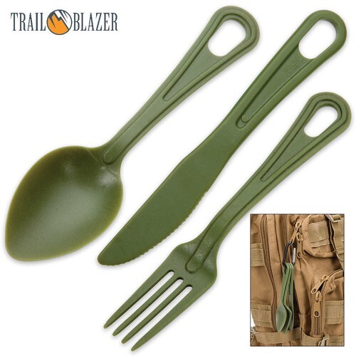This cutlery set includes a bamboo fork, knife, spoon. The bamboo is heat and stain resistant that won't absorb flavors. The set is neatly packed inside a carrying case that is made from recycled plastic bottles. Replaces 1300 Single-Use Utensils Throughout Its Life Set includes Fork, Knife, Spoon Utensil Case Made From 100% Post-Consumer Recycled Plastic Bottles Carabiner on Back Clips Anywhere Heat and Stain Resistant Hand-Finished With A Food-Safe Coating BPA and Phthalate Free Dishwasher Safe Materials: Made of natural, responsibly sourced bamboo. Package made from recycled PET. Care Instructions: Hand wash preferred with soap and water but will sustain the dishwasher. Dimensions: Package: 7"H x 2.4"W x 1.3" D Utensil Length: 5.75"h Weight: 1.6 oz. / 0.1 lbs.