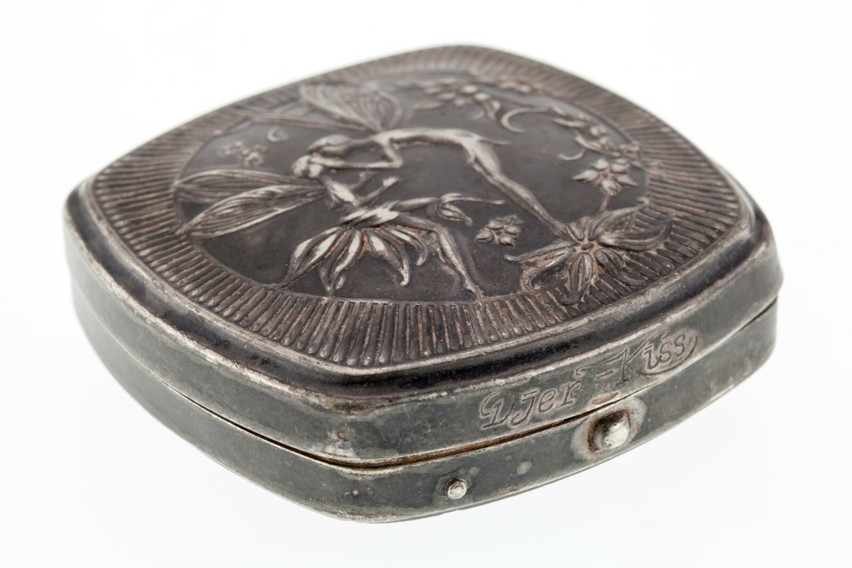 Silver plated cushion shape powder compact case with repose kissing fairies