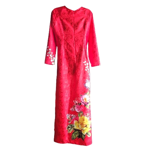Celebrate tradition with this vibrant crimson Ao Dai, featuring an exquisite multi-colored floral arrangement. The rich red fabric is subtly embossed with a traditional damask-style pattern, adding depth and texture to the garment. This tunic is a perfect choice for Lunar New Year (Tet) festivities, weddings, or cultural ceremonies. It features a modest and classic round neckline for a sophisticated silhouette. Designed with full-length sleeves that maintain a traditional and sleek profile. The Ao dai is highlighted by a stunning vertical cluster of roses and blossoms in shades of pink, yellow, and off-white that cascade down the front and back. Includes a convenient center back zipper for a secure, tailored fit. Pants not included.