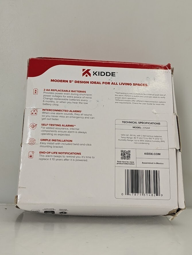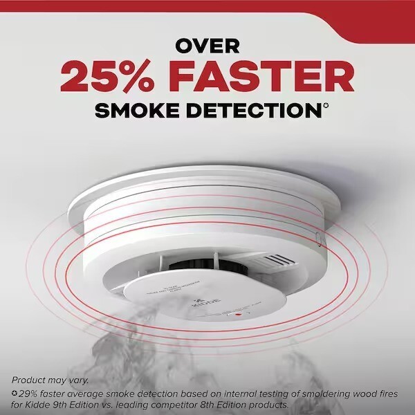 Experience the next level of fire safety with the Kidde Hardwired Smoke Detector, AA Battery Backup, Interconnectable LED Warning Lights, model 20SAR. This smoke detector has enhanced sensing technology that reduces false alarms often caused by cooking and sends fast alerts that help give your family more time to get out safely. Plus, it is interconnected so when one alarm sounds, they all do so you never miss an emergency (see user guide for compatibility with other Kidde models). This alarm offers a modern 5-inch design ideal for all living spaces such as living rooms, hallways, kitchens, bedrooms. Comprehensively tested and designed to the latest UL standard for safety and reliability, the 5-inch smoke alarm is powered by 120V AC wiring with 2 AA alkaline replaceable backup batteries (included) for continual detection even during outages. Batteries should be replaced every 6 months. When smoke is detected, the red LED light will flash in time with the loud 85-decibel alarm to help you seek safety. A test-hush button allows you to test the battery operations as well as silence nuisance alarms, should they occur. In addition, the detector is self-testing and easy to install with the included twist-and-click mounting bracket. Meets requirements of 9th Edition UL 217 and FCC. Does not meet requirements for CSFM.