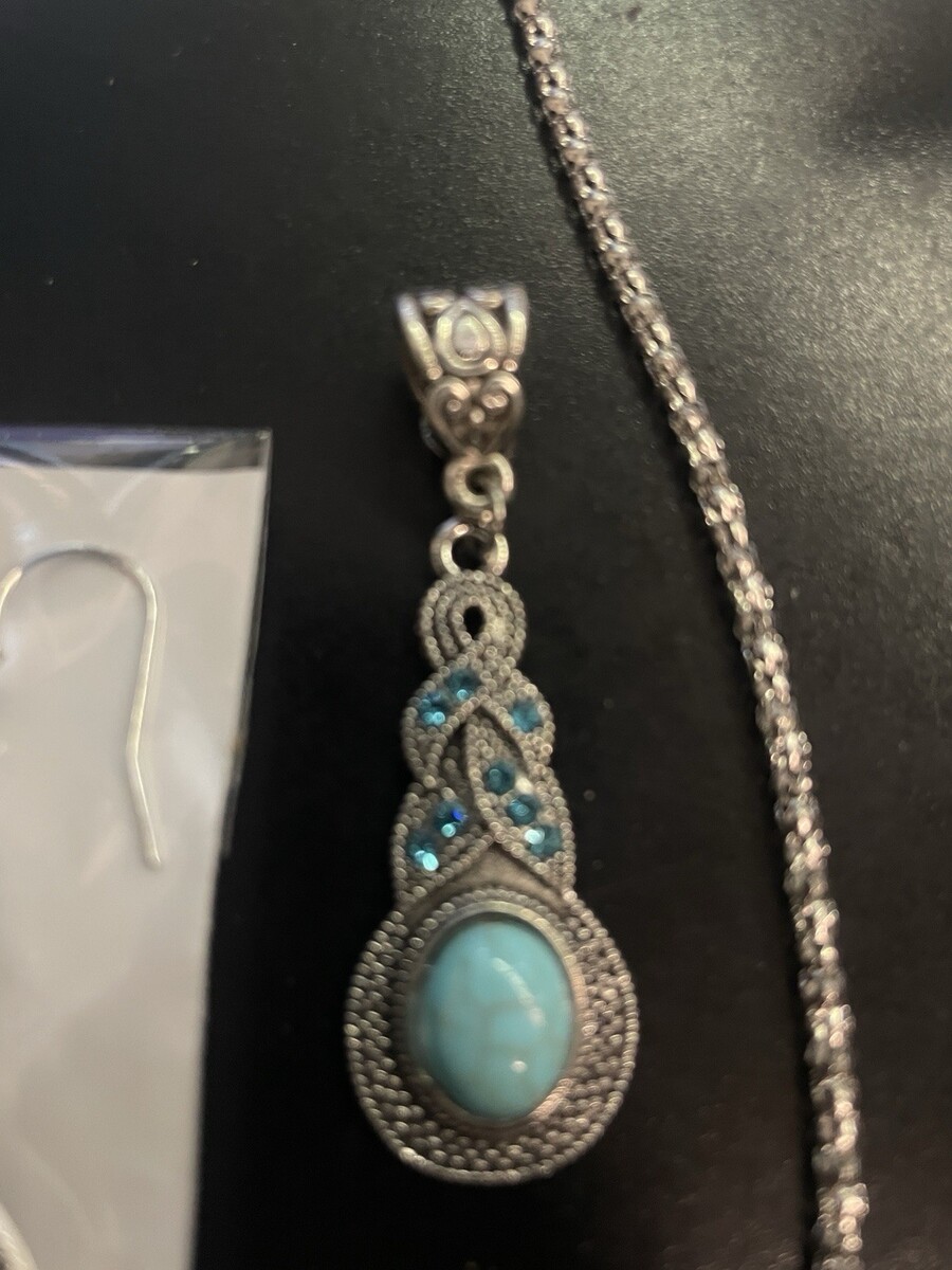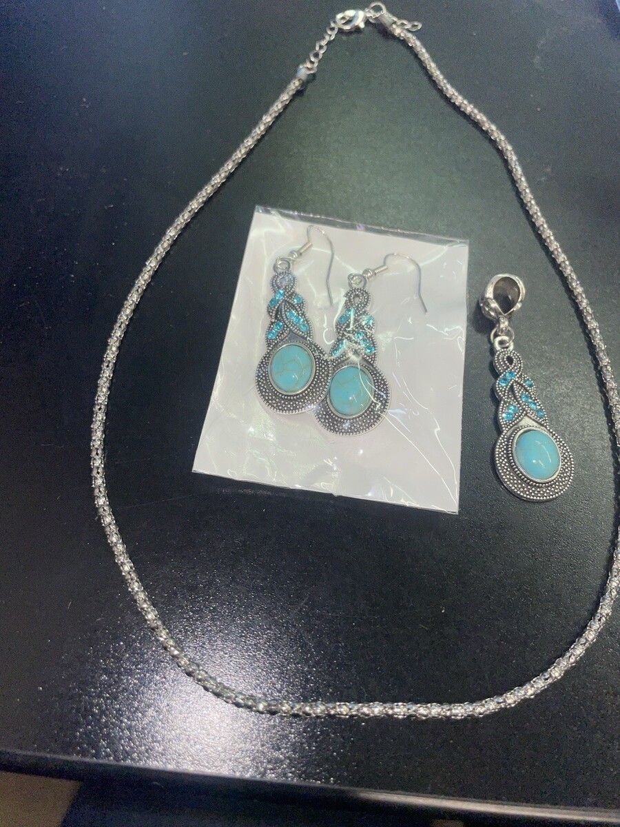 Turquoise Stone and Rhinestone Pendant Chain Necklace and Earrings Jewelry Set