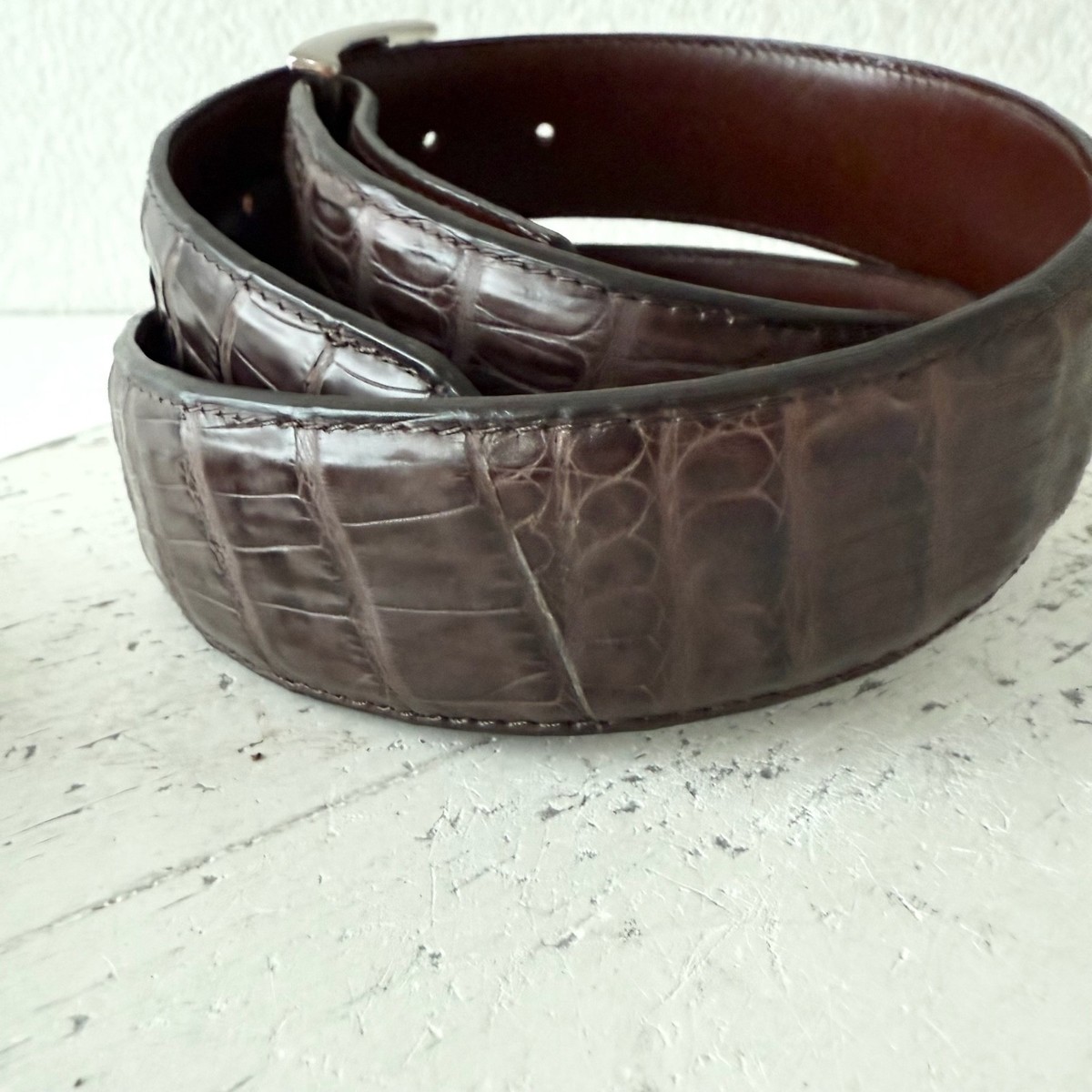 The belt is leather lined, finished with a classic silver-tone buckle, and stamped on the interior with Rod Patrick branding, ?Genuine Caiman Leather,? and ?Handmade in Mexico.?