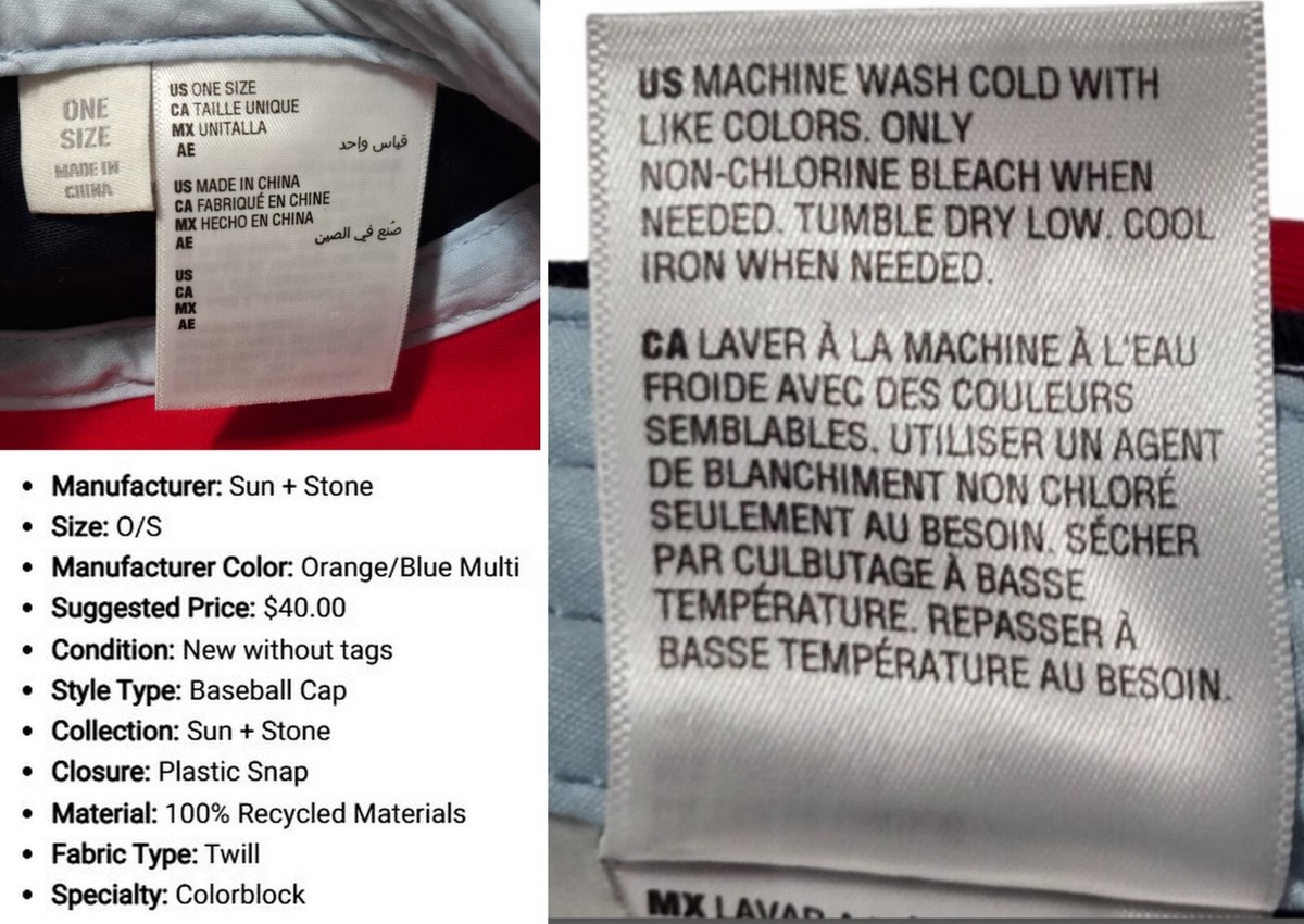 Elevate your casual wardrobe with the Sun + Stone Men's Colorblock Adjustable Ball Cap. The eye-catching orange and blue multi-pattern design adds a vibrant touch to any outfit, while the twill fabric, made from 100% recycled materials, offers both sustainability and durability. With an adjustable strap, this baseball cap provides a comfortable fit for all sizes, ensuring it's a versatile addition to your accessory collection.