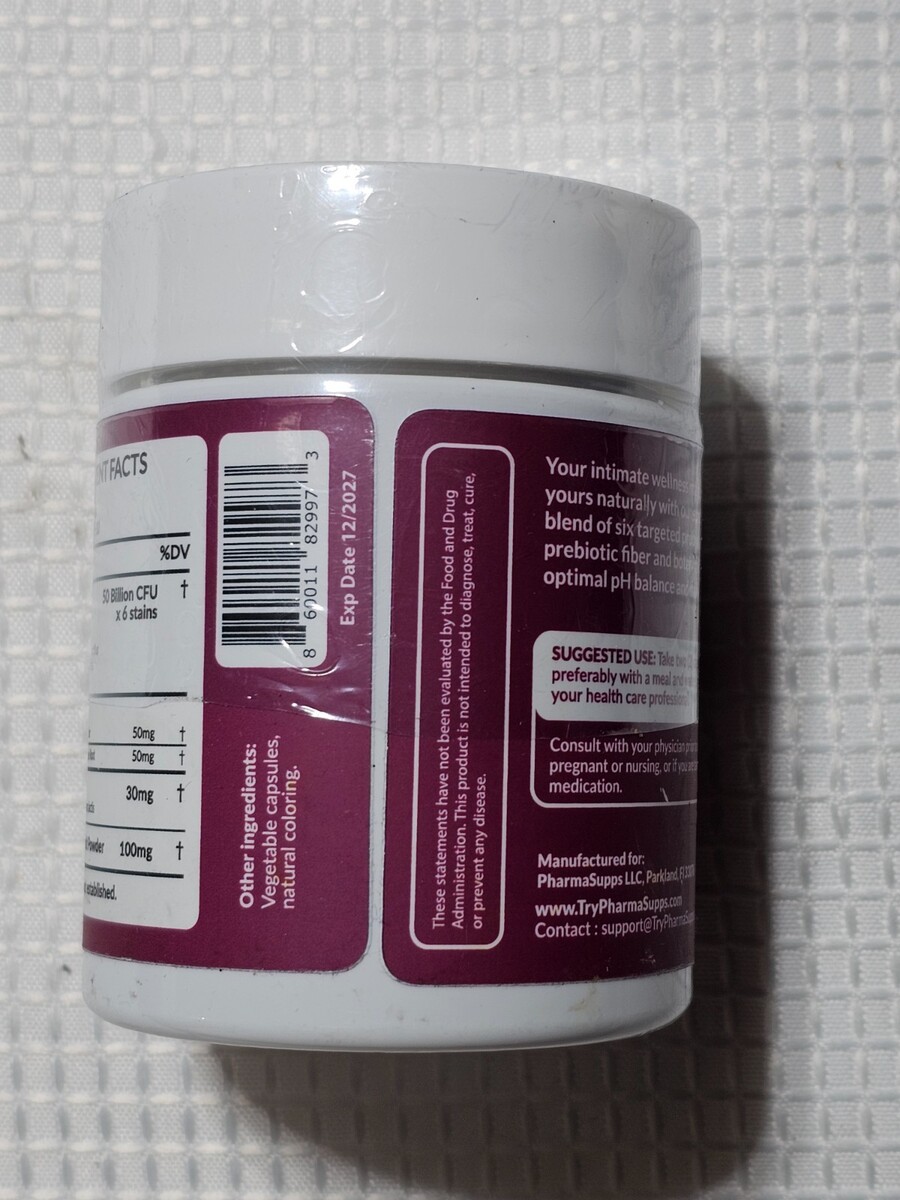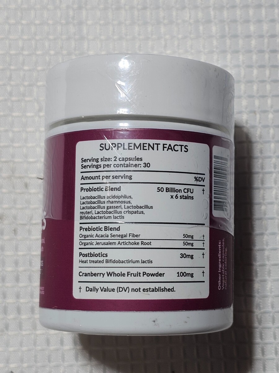 Product Description: This listing is for a bottle of vaginal probiotic dietary supplement capsules with cranberry whole fruit powder. The bottle contains 60 capsules and is factory sealed, as shown in the photos. Formulated with a blend of probiotics, prebiotics, and postbiotics, this supplement is made in the USA and pharmacist formulated. Expiration date is 12/2027 (see photo for verification). This product is sold as a dietary supplement only and is not intended to diagnose, treat, cure, or prevent any disease. Ships exactly as pictured.