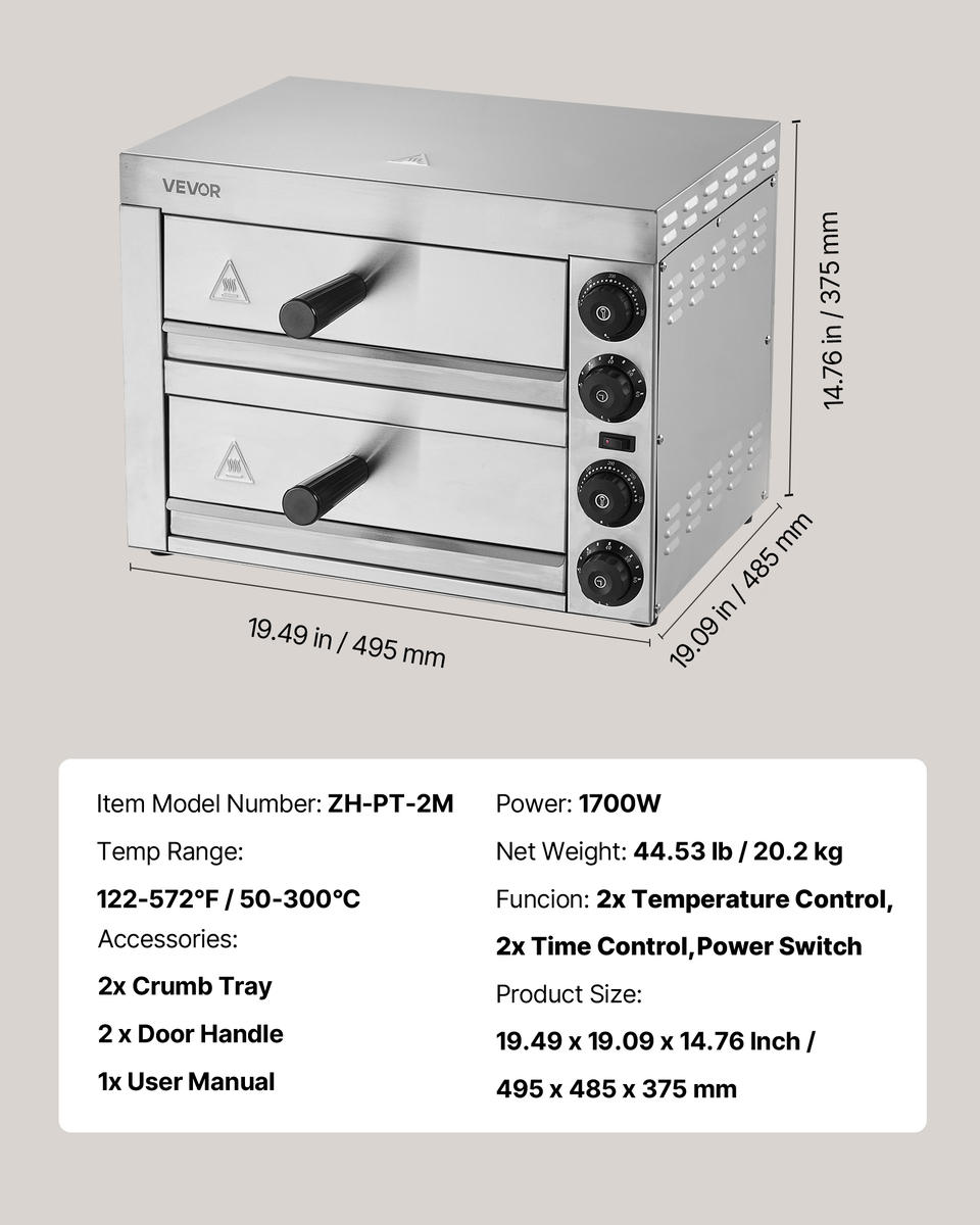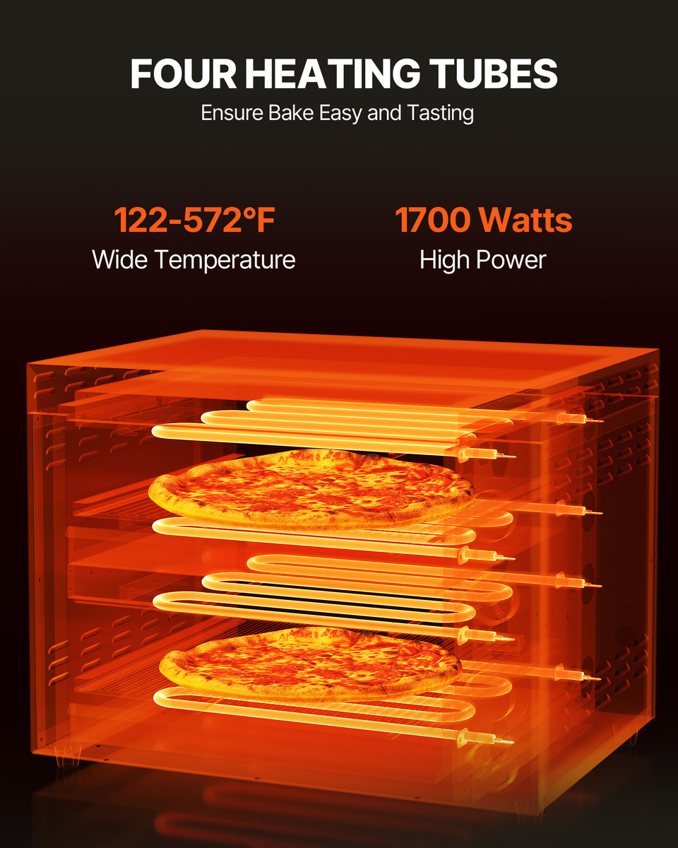 Enjoy Crispy Pizzas Every Time: The 1700W powerful commercial pizza oven empowers you to bake crispy and yummy pizza just in few minutes. Coupled with top and bottom dual heating tubes, it unleashes 360 uniform baking and sufficient heat to swiftly cook your food to deliciousness every time