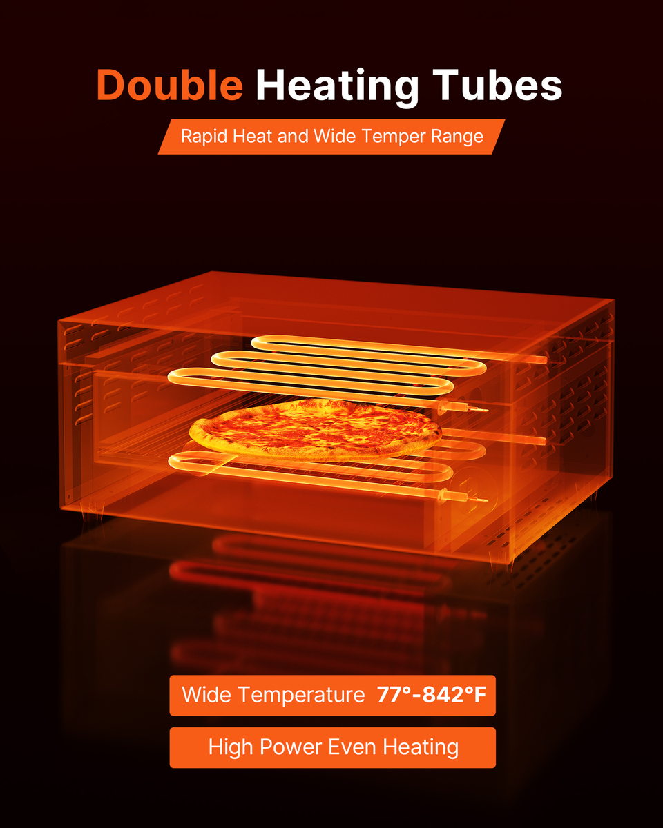 Enjoy Crispy Pizzas Every Time: The 1740W powerful commercial pizza oven empowers you to bake crispy and yummy pizza just in a few minutes. Coupled with top and bottom dual heating tubes, it unleashes 360 uniform baking and sufficient heat to swiftly cook your food to perfection every time
