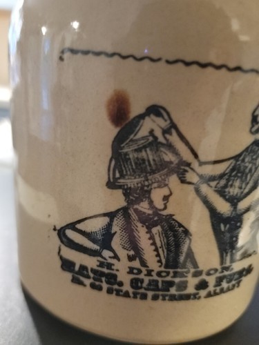 Vintage Pearson's of Chesterfield Stoneware Pitcher w/ Blue Promotional Graphic.Has brown stain on front and a line on the lip which are imperfections made while being made. Otherwise good condition.