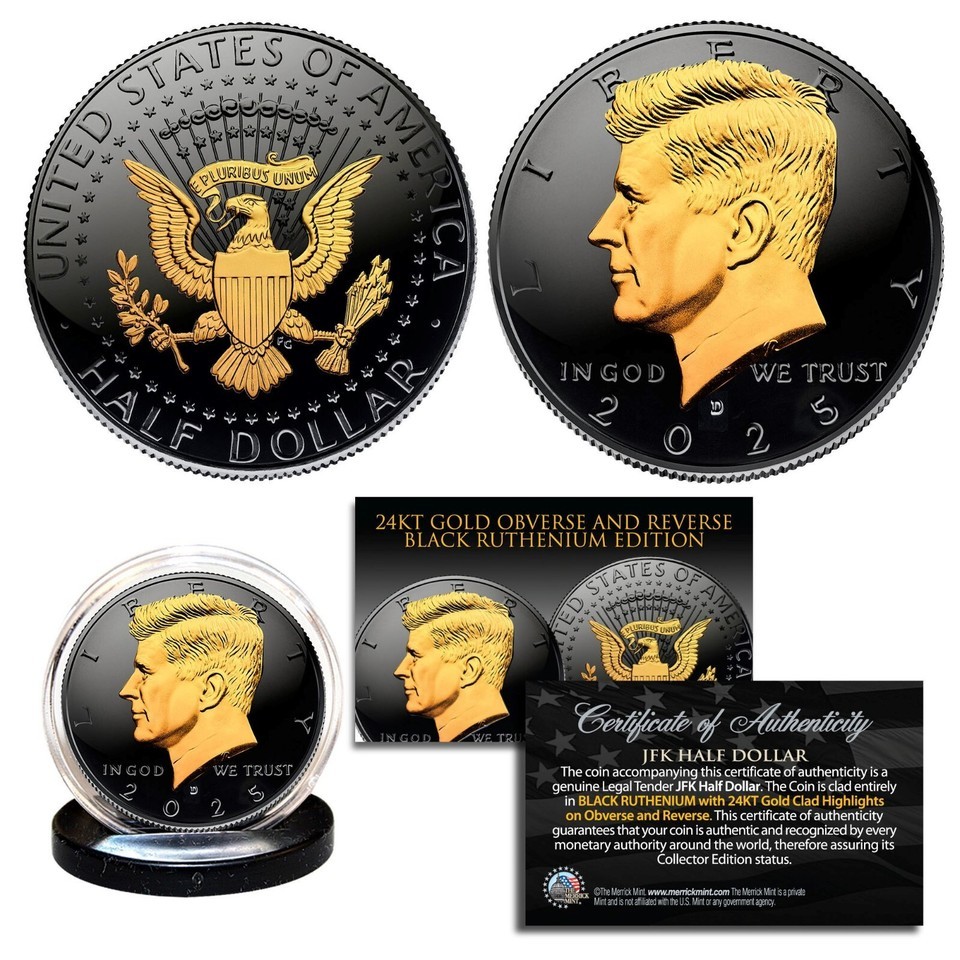 Black RUTHENIUM 2025 JFK Kennedy Half Dollar U.S. Coin 2-SIDED 24K Gold - D MINT