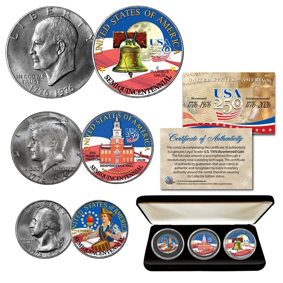 stunning 3-Coin Semiquincentennial Set, featuring genuine U.S. Bicentennial