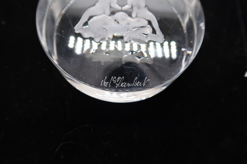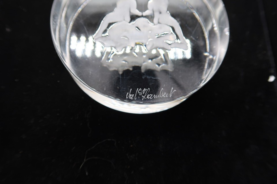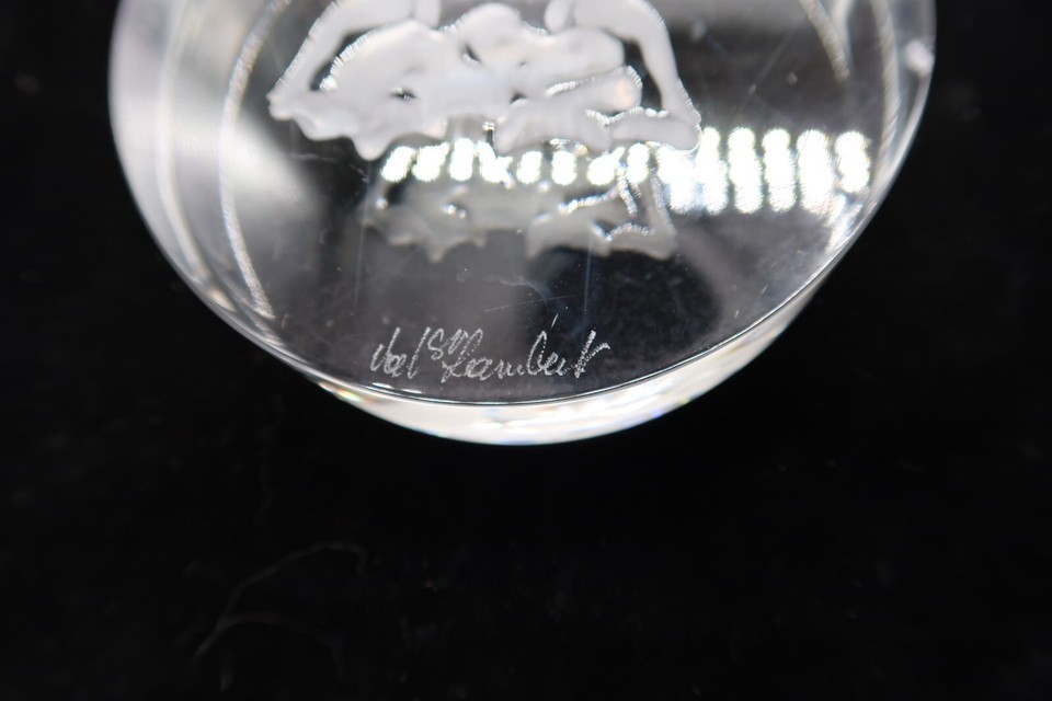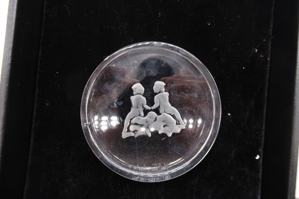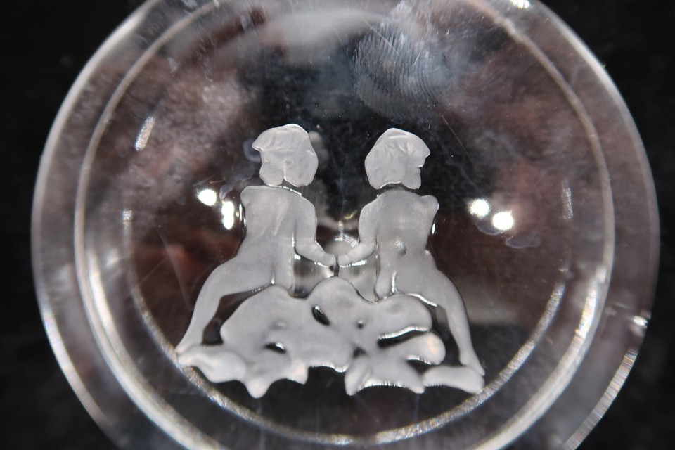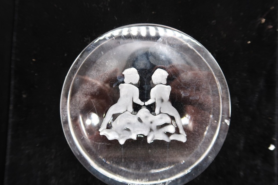 Vtg Signed Val St. Lambert Clear Etched Gemini Zodiac Paperweight