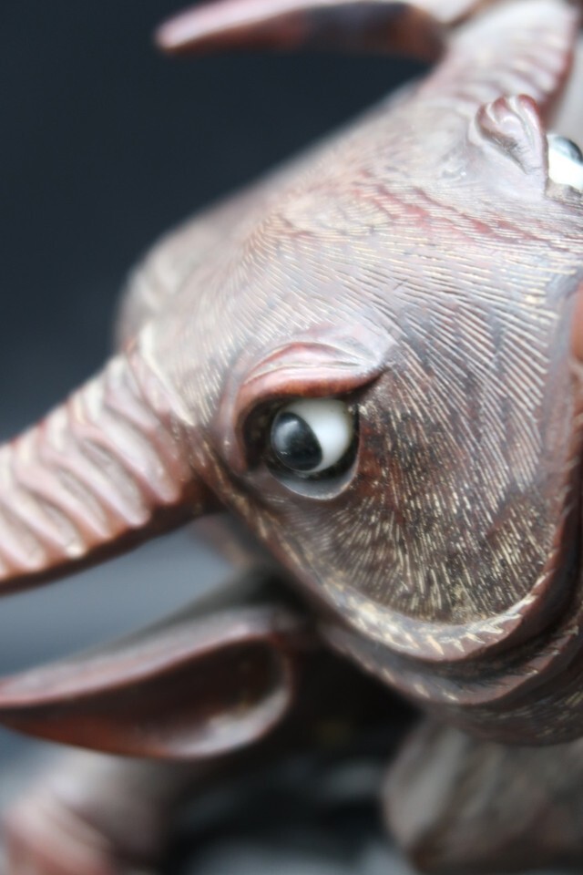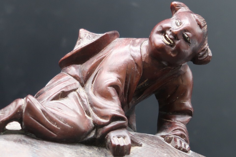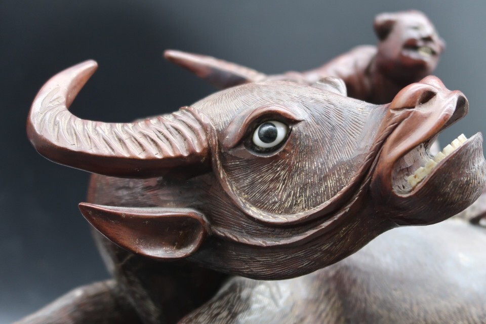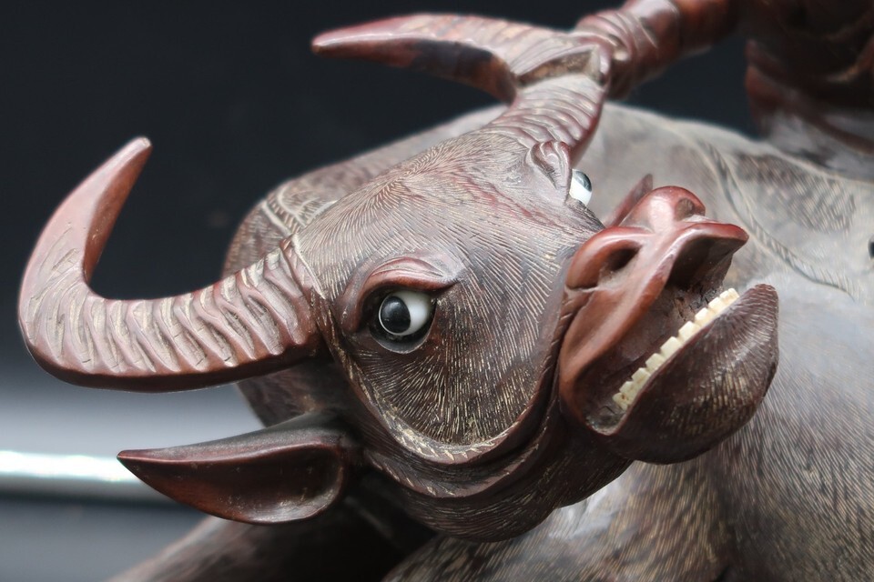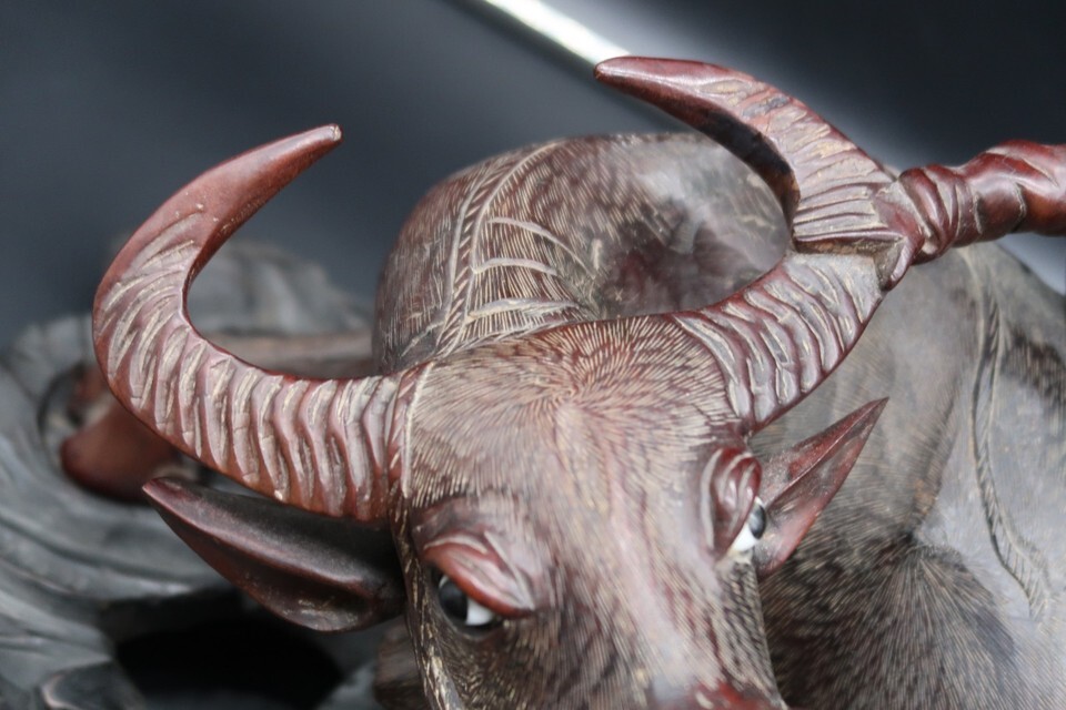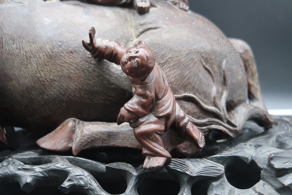 Large 19th C. Chinese Teak Carved Wood Water Buffalo W/ Children W/ Stand As Is